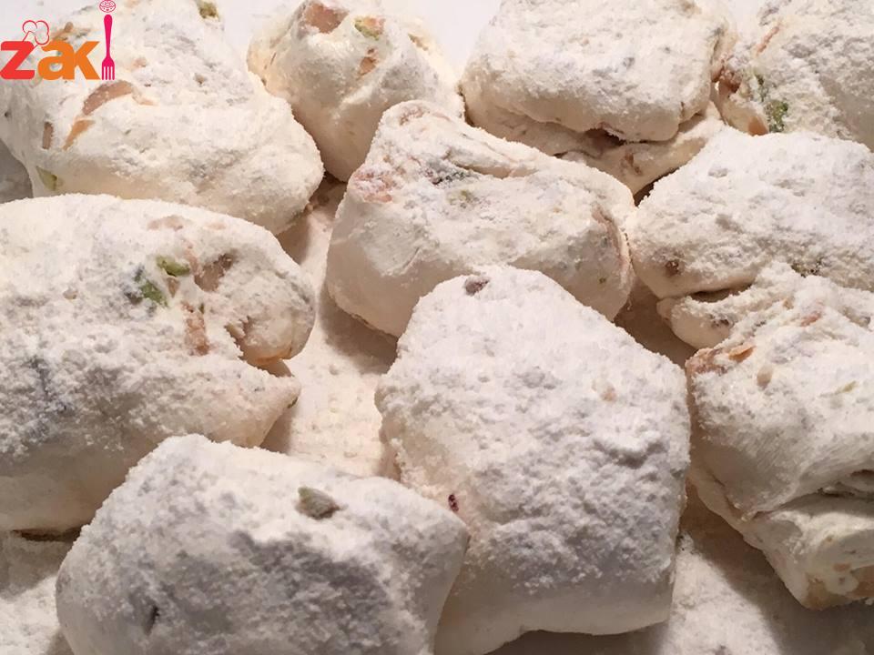 وا للمن وا السلوئ نحظر صحن عليه طحين كثير وا نصب الخليط وا للنوجا نجيب نايلون ندهن عليه شويه زيت امشان ما يلزق مع انها روعه ما بتلزق كثير بسبب السمنه اذ بدكم رول اعملوها او مربعات حسب ما بتحبو وا نلفهم تمام انا خليتهم ثلاث ساعات با الثلاجة بردو وا قطعتهم سوا النوجا او السلوئ وا صحة وا عافيه Monaliza Albo