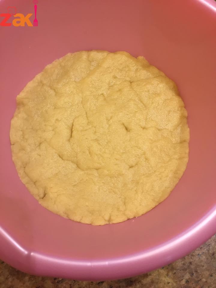 نضع السكر على الطحين, ونفركه بالزيت والزبدة بواسطه أطراف الأصابع, ثم نعجنه بالحليب