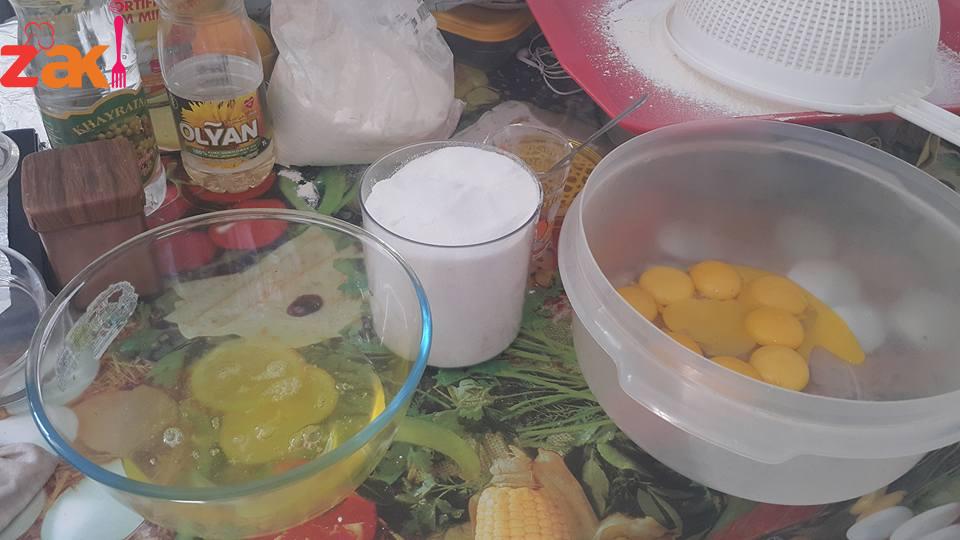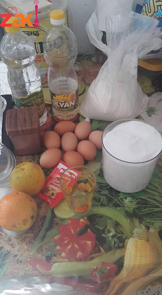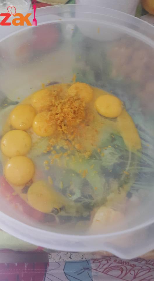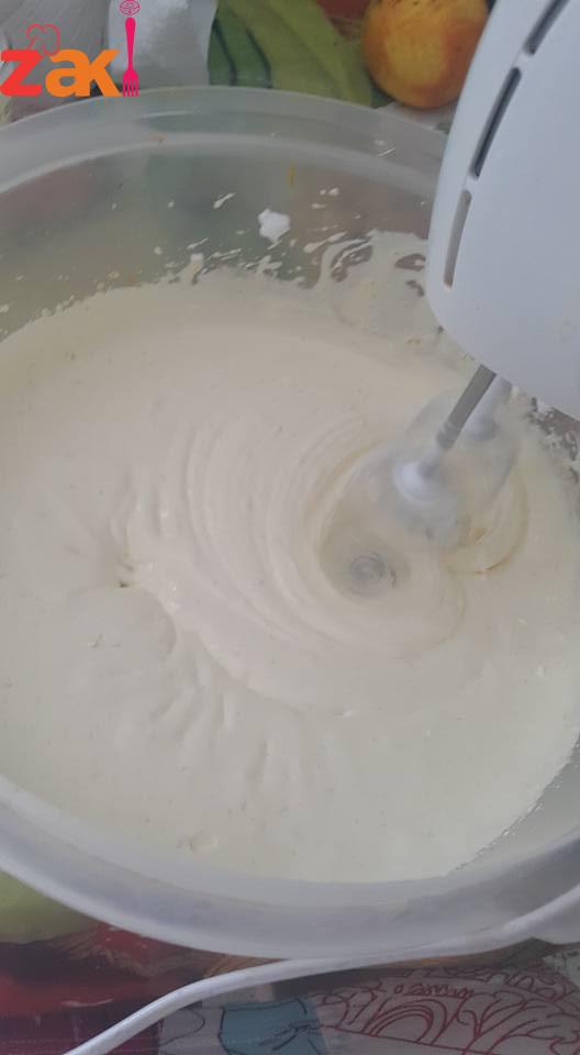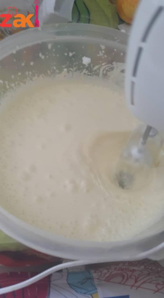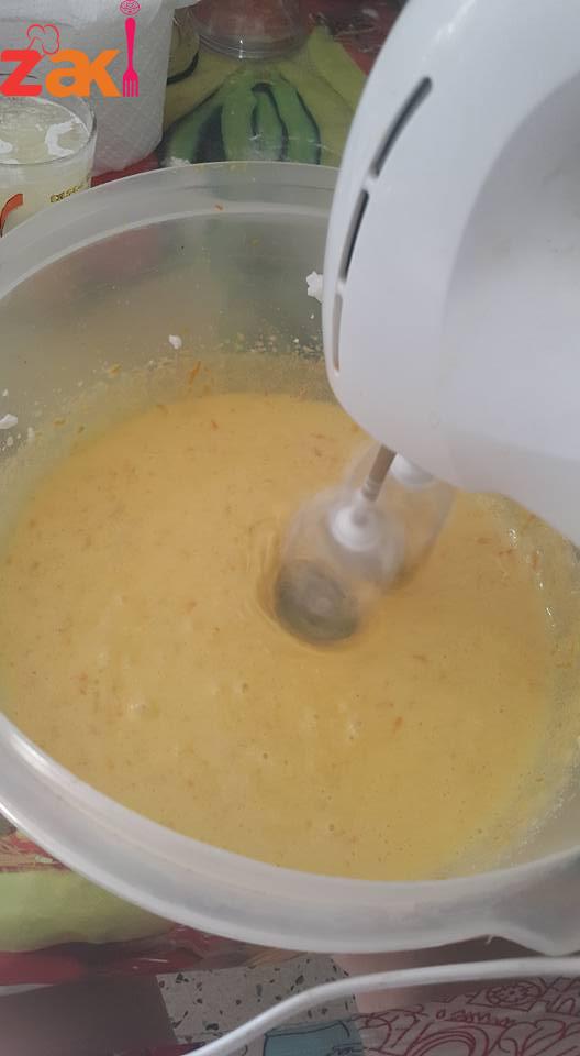 الصفار?مع قشر البرتقال نخفقهم دقيقة وبعدها نحط كوب سكر بتدريج مع استمرار الخفق