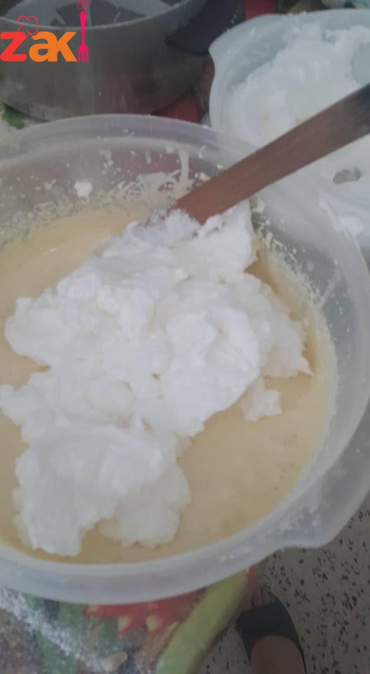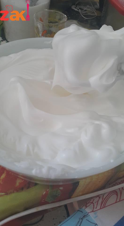 نخفق البياض مع رشت ملح وكوب سكر وملعقة خل حتى نحصل على مرنك نتركه جنب