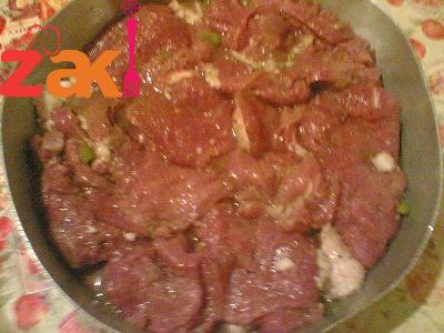 نضع بها الزيت، تقلب اللحمة في الزيت تقليبه، نضع عليها البصل وكل البهارات في تلك الوقت.
