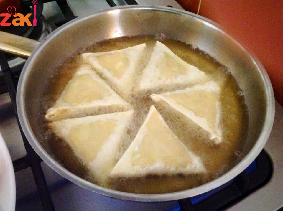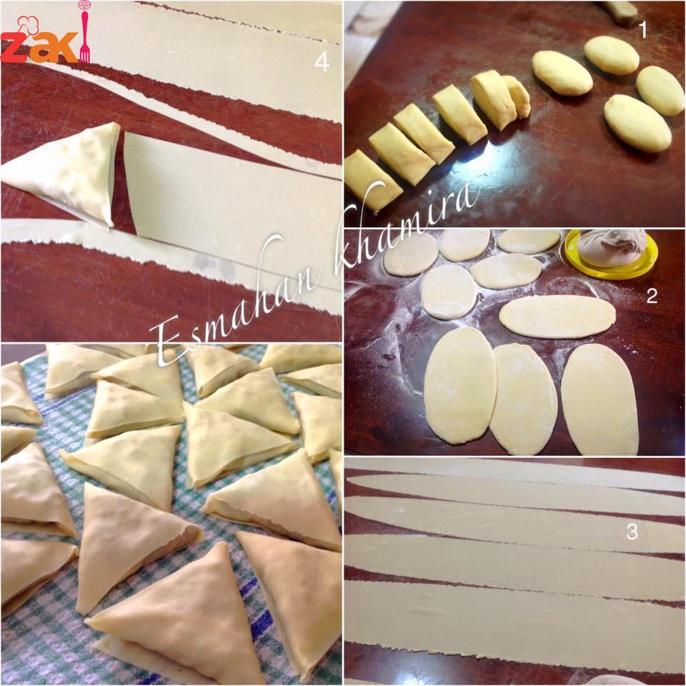 تقطع العجينة وترش بالنشأ وتفرد كل قطعة قليلاً بالعصا ثم تمرر فى ألة الفرد أبتداءً من أول رقم حتى آخر رقم لتتحصلى على شرائط طويلة ورقيقة ، تخلصى من جوانب العجين لكل شريط ثم ضعى قليل من الحشوة على الطرف ولفى شريط العجين على شكل مثلث كما بالصورة ، تقلى بعد ذلك وتقدم للأكل دافئة