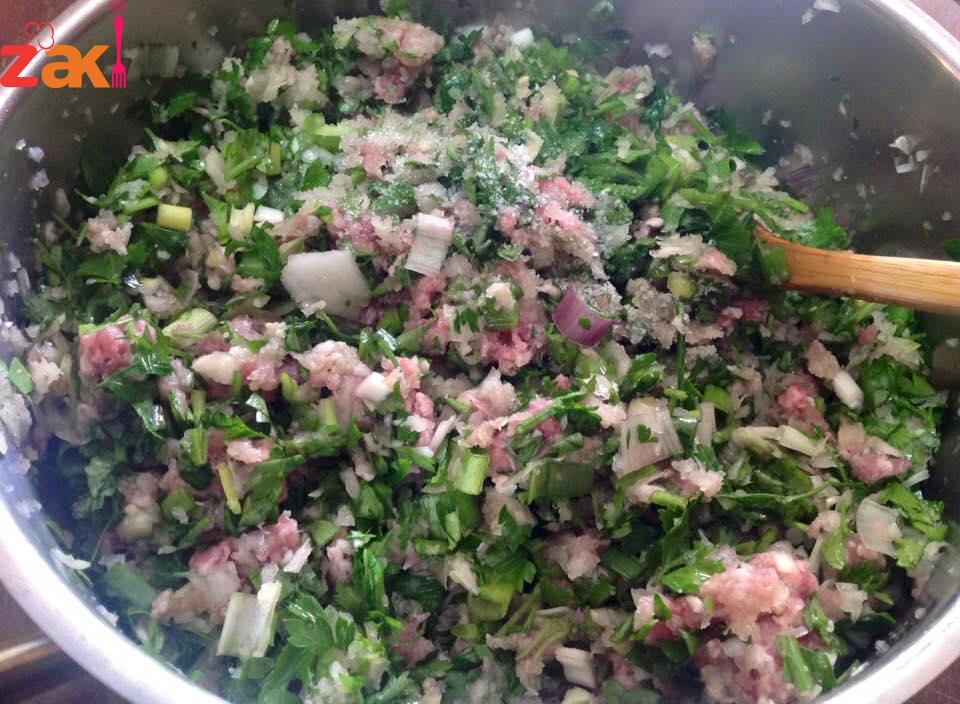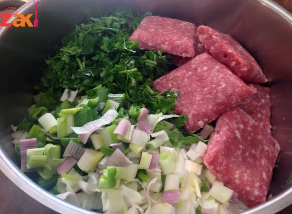 للحشوة / لحم مفروم / بصل ومعدنوس مفرومين وملح