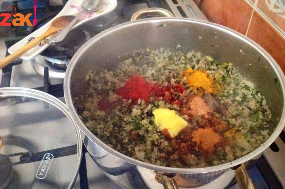 يخلط اللحم المفروم مع المعدنوس والبصل والملح ويوضع فى طنجرة مغطاة على نار هادئة حتى تنضج وقبل أن تجف من الماء تماماً يضاف اليها كل التوابل تحرك وتترك حتى تجف ثم ترفع من على النار وتترك لتبرد
