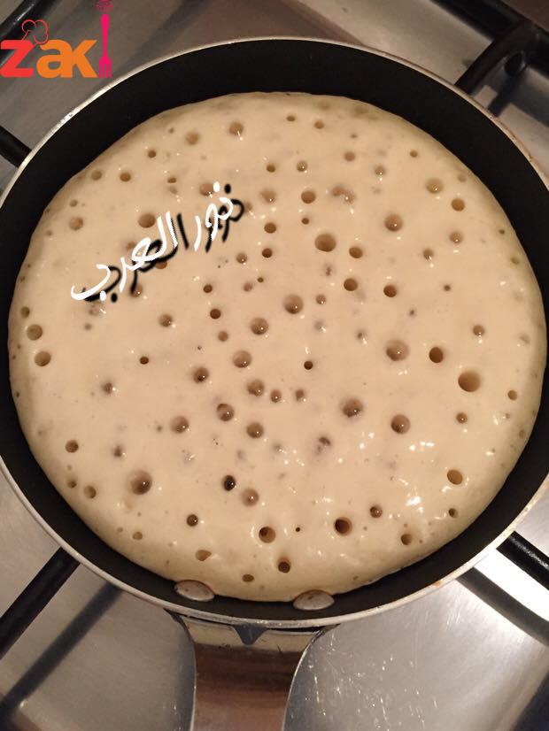 نخلط النواشف معا وهي كوب ونصف طحين ورشة ملح وملعقة صغيرة سكر ونصف ملعقة صغيرة كربونات و2 ملعقة صغيرة بيكنج بودر / نخلط بالمضرب اليدوي او الكهرباء كوب لبن رائب ونصف كوب ماء وملعقتين كبار زيت وبيضة واحدة وبعد الخلط تضاف لخليط النواشف وتخلط جيدا وتترك ترتاح اقل شي 5 دقائق ونملأ نصف الكوب من الخليط وتسكب بالقالب على نار هادية حتى تتكون فقاعات وتقلب على الجانب الاخر