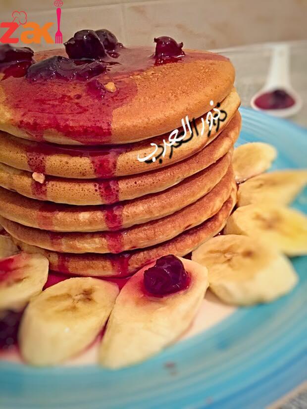 وتقدم ساخنة كفطور بالصباح او كحلو بالمساء وتوضع كمية من الصوص بين الطبقات انا استعملت مربى وممكن عسل نحل ،،، (الي ماهو متوفر عندها اللبن الرائب تستعمل حليب وتضيف له ملعقة كبيرة خل ، والقالب اول مرة يدهن ومن بعد خلاص )