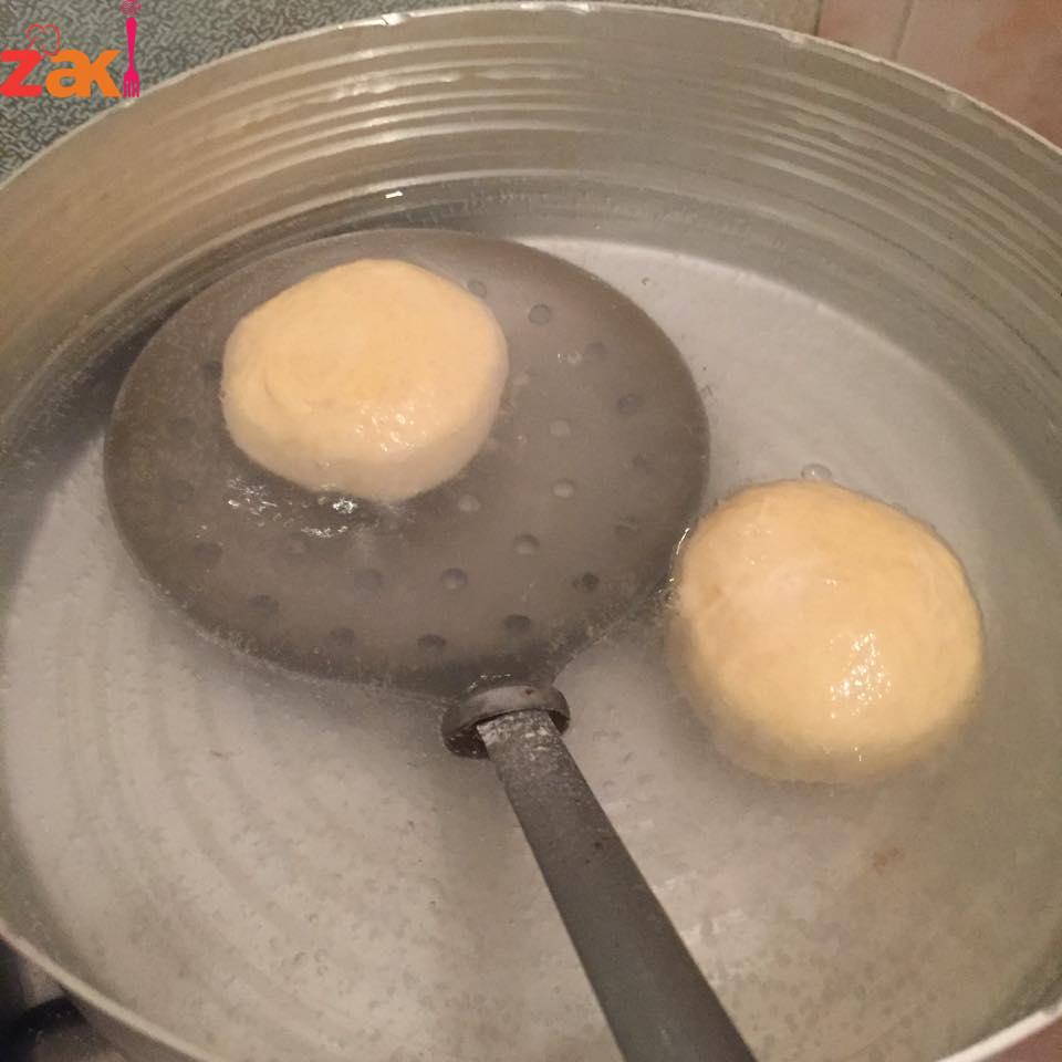 تقرص اي شكل ترغبين وتوضع جانبا على كمية من الطحين وعند الانتهاء نجهز : 6كوب ماء مغلي في قالب كيك واسع ونضيف للماء المغلي ربع كوب بيكنج صودا ( كربونات ) ونضع القالب على نار هادئة جدا