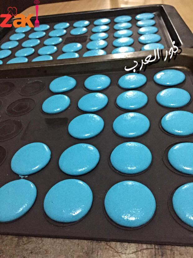 نحط القالب في الفرن ويكون مسخن على اقل درجة من تحت النار فقط ونراقب الماكرون من غير فتح الفرن تقريبا تلاحظي انتفاخ الماكرون وتكون الياقة اللي هي الحلقة من الأسفل نوقف تشغيل الفرن ونتركه حتى يبرد نهائي ونخرجه ونحشيه اي حشو منكن مربى او جناش او نوتيلا