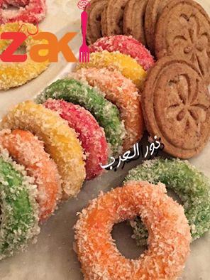 كعك معسل : كوب سمن ذائب او زبدة وكوب زيت وكوب ماء زهر وملعقة كبيرة بيكنج بودر ورشة ملح وملعقتين سكر ناعم وطحين حسب ماتحتاج العجين ….. بعد ان تخلط السوائل جيدا يضاف الطحين وتترك ترتاح نصف ساعة وتشكل وعلى الفرن وبعد الاستواء تغمس في العسل الثقيل وتغمس بجوز الهند .