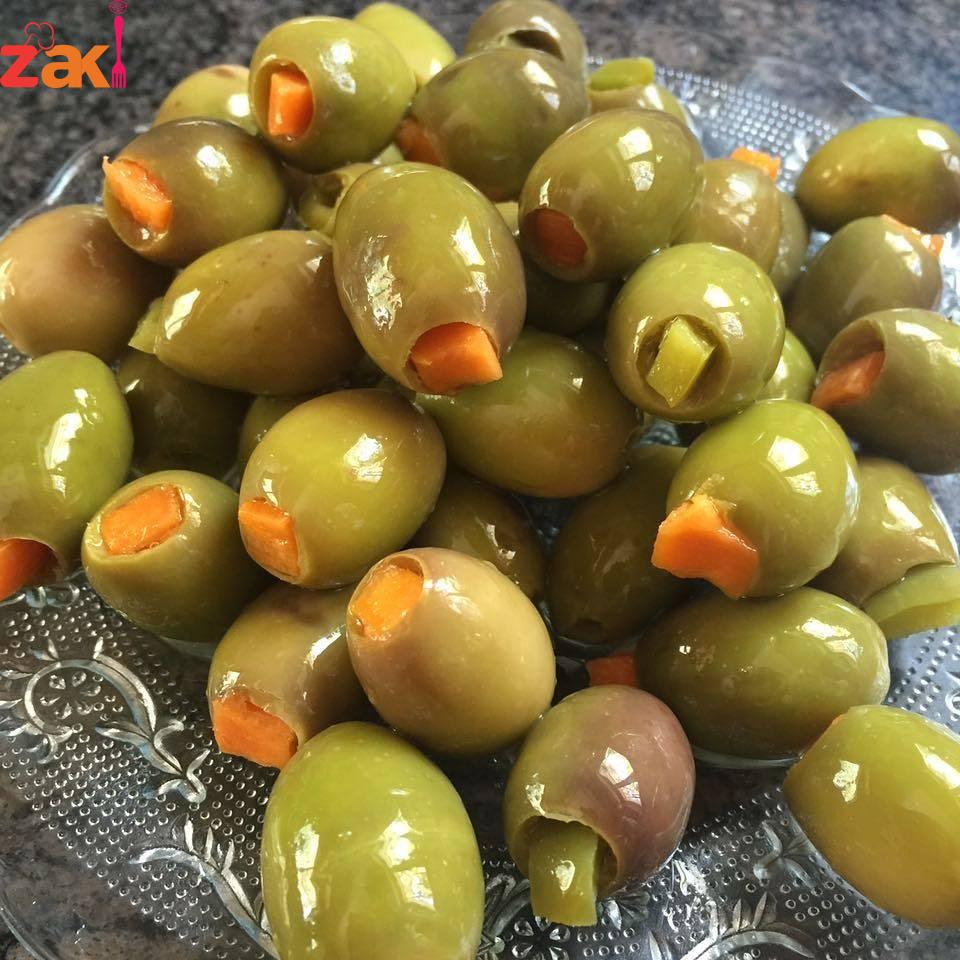 كيلو زيتون نوعيه جيده وهو البعل افضل شي بتشيلي البزر منو من مكبس الزيتون وبترشي معلقه ملح كبيره عليه ومعلقه ملح ليمون واتركيه لمده ساعه بهاد الوقت بتفرمي جزر وفليفله بشكل طول حتى يسهل عليكي حشي الزيتون وبترشي ملح عليه وكمان رشه ملح ليمون واتركيه نص ساعه حتى يتصفى واحشي حبه بجزر وحبه فليفله وﻻن دوبي 6 مﻻعق كبارملح بليتر مي وضعيه على مرتبان الزين ونص كوب عصير ليموون
