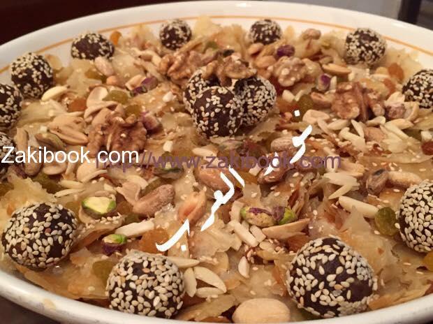 – ووزعيها باطباق التقديم والزينة من فوق كورات تمر وزبيب ولوز محمص ويفضل انك تحطي بجنبها طبقين صغار واحد فيه عسل نحل والثاني فيه سكر ناعم و يقدم بجوارها كوب لبن .