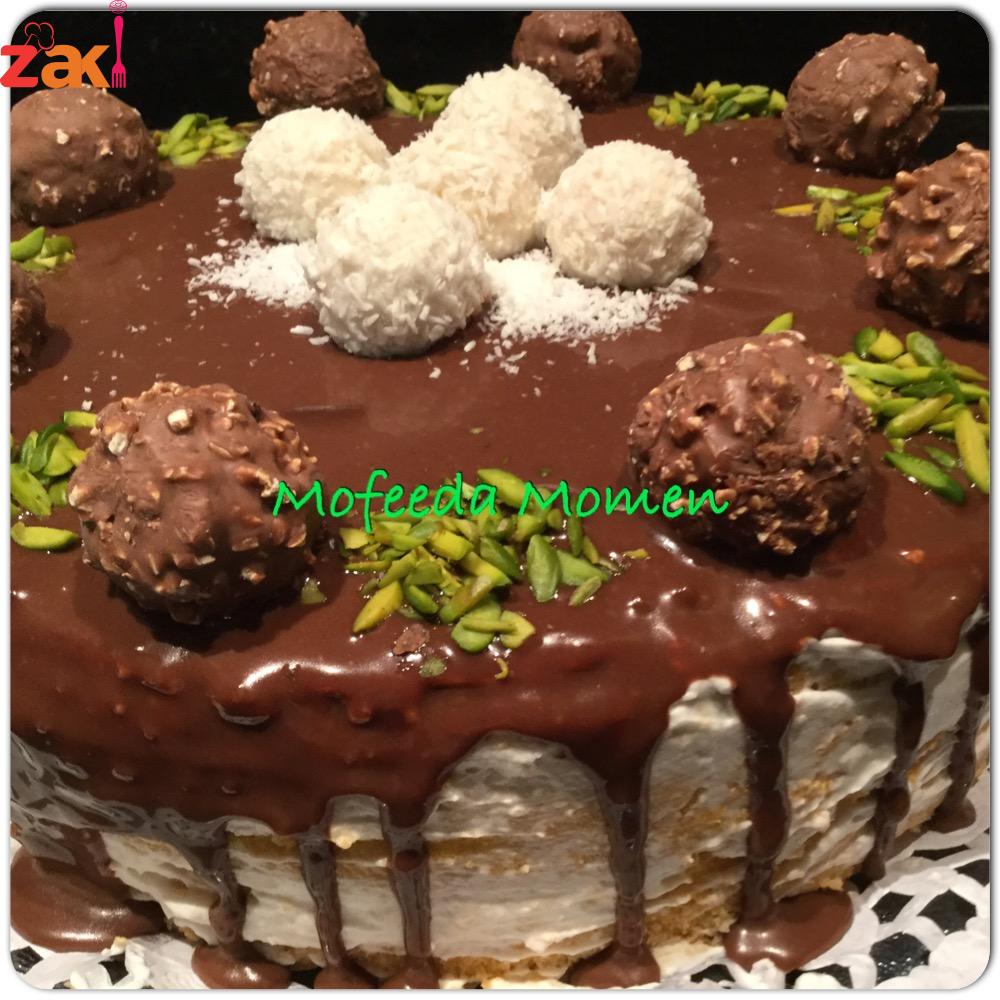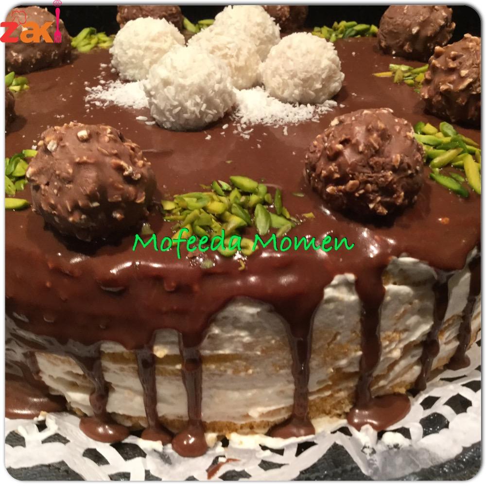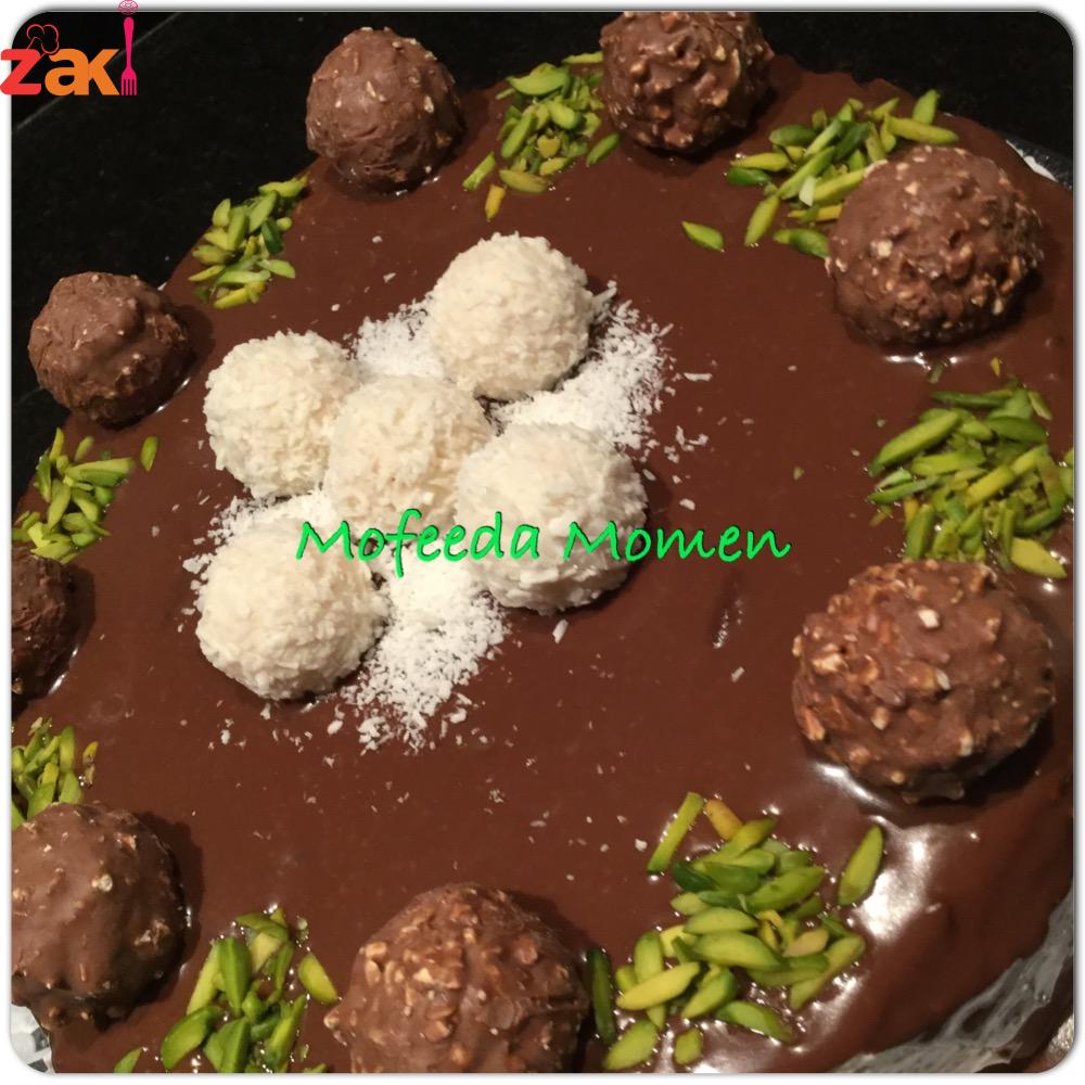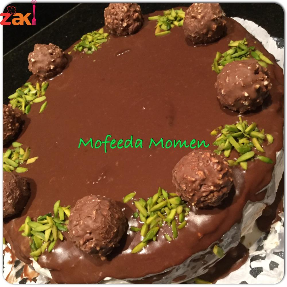 ومع كيكة التورتة الهشة والخفيفة والمنفوشه وبدون محسن للكيك وناجحة مئه في المئه بطعم الفانيليا وحشو الكريما البيضاء والتزيين بالشوكولاتة وحبات الفريرو روشيه وشيكولاته رفايلو