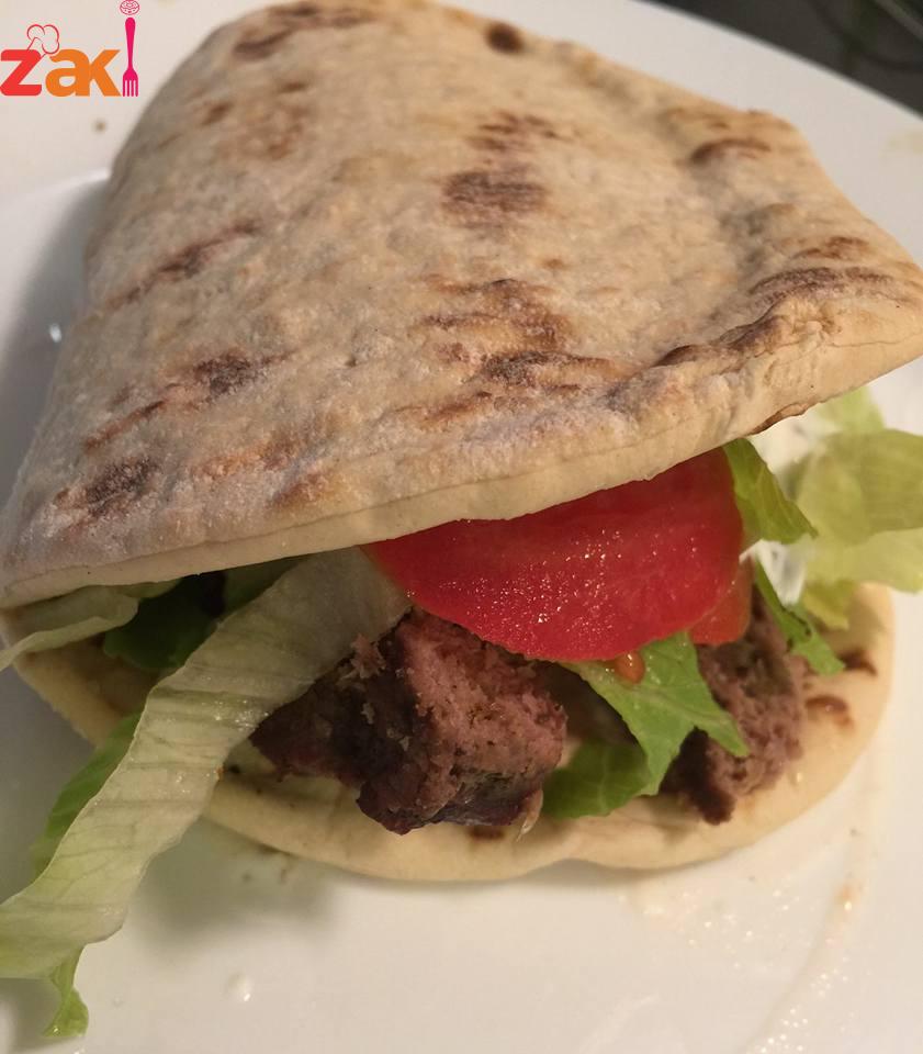 نسخن الخبز نضع ملعقه-كبيره من الصوص في السندويتش اللحمه وبندوره وبصل وخس نلف السندويتش ويقدم.