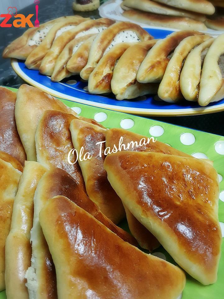 بصحن غميق بنحط كاس حليب بودرة .. معلقتين كبار خميره ..معلقتين كبار سكر .. كاستين مي دافيه .. بنخلطهم مع بعض وبنتركهم خمس دقايق حتى تفور الخميره.. بنحطهم فوقهم نص كاس زيت .. معلقه كبيره بيكنغ باودر .معلقه صغيرة ملح .. وبنخل 4 كاسات ونص طحين اكتر شوي وبنعجنهم حتى تتكون عجينه طريه مابتلزق بنتركها تتخمر ساعه وبتشتغلو فيها … .. والف صحه