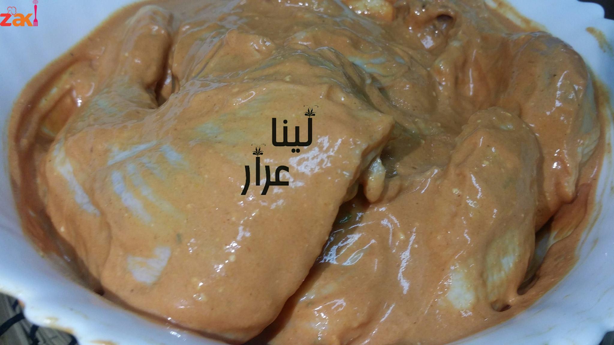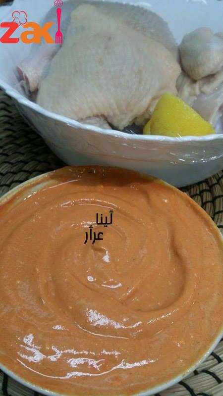 المقدار يكفي لدجاجتين 2 علبة لبن زبادي حجم صغير مع 3 م ك مية بندورة وعصير نص ليمونة و2 م ك زبدة ورشة ملح مع معلقة صغيرة من التوابل ( فلفل اسود ، اوريجانو ، كاري ، بودرة ثوم ) حطيت تقريبا ربع ملعقة صغيرة صبغة صفار الزعفران مع معلقة صغيرة صبغة حمرا وخلطتهم كلهم منيح بنظف الدجاج منيح بالخل والليمون والطحين مع ابقاء الجلد ، بنخلط الدجاج بالخلطة وبنحاول برفق ندخل الخلطة لتحت الجلد وبنخليهم ليلة كاملة بالثلاجة.