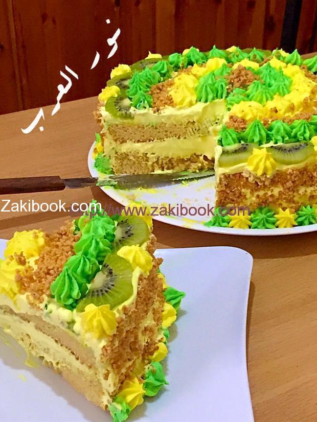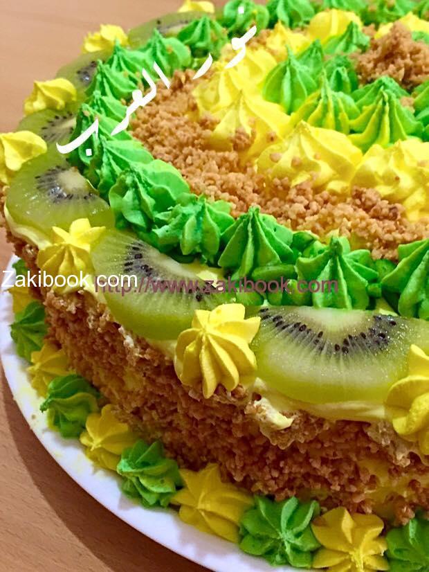 – وبعد ان تنضج وتبرد ويفضل ان نشتغل بها ثاني يوم, تشق لثلاثة او اربع شرائح وتسقي الطبقات بالعصير وتحشى بكريم شانتي ملون بالاصفر وترص فوقها قطع كيوي صغيرة وتغلف من الخارج بالشانتي الملون بالاصفر والاخضر ومن الاطراف بالبندق او الفول السوداني وتوضع شرائح كيوي على سطح الكيكة.