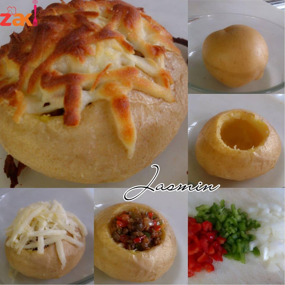 حبة بطاطا متوسطة بنحطها ببيركس ونغلفه بنايلون وندخلها الميكروويف 7د وبنطلعها وبنقيم بمعلقة جزء صغير من البطاطا من فوق ونطلع اللب ونحشيها بالتتبيلة وعالوش قشقوان وندخلها الفرن 15د