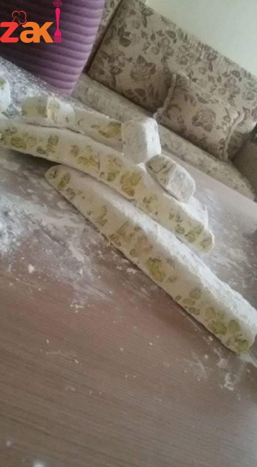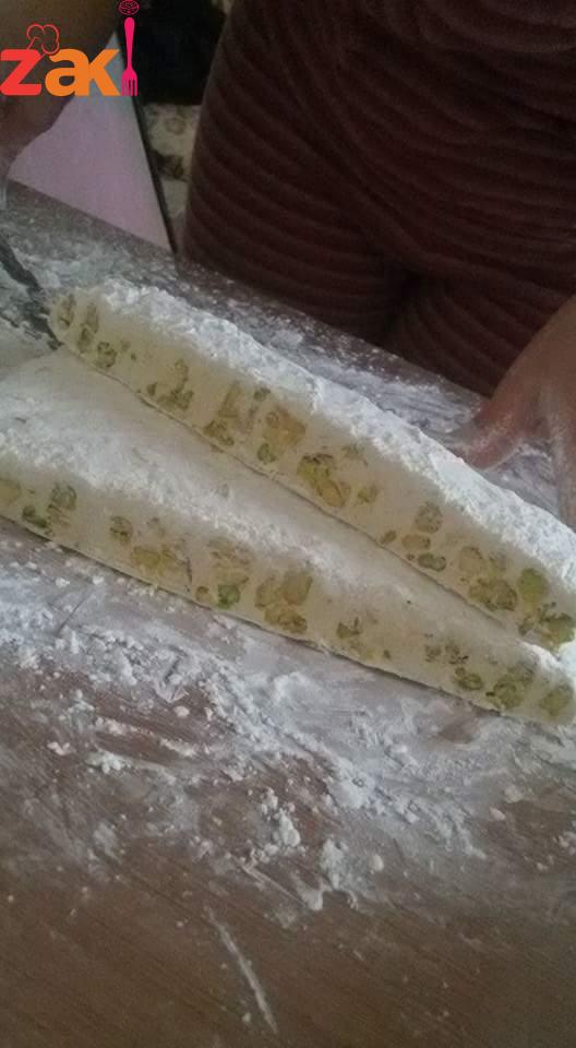 ثم رشي كمية من نشأ الذرة في صينية وافردي العجينة عليها كي لاتلتصق بالقالب واتركيها لمدة 24 ساعة في البراد اوالثلاجة كي تتماسك وثم اخرجيها من القالب وقطعيها بسكين مرشوش عليها مقدار من النشأ كي لاتلتصق بالسكين عند التقطيع وتؤكل بالهناء والف عافية