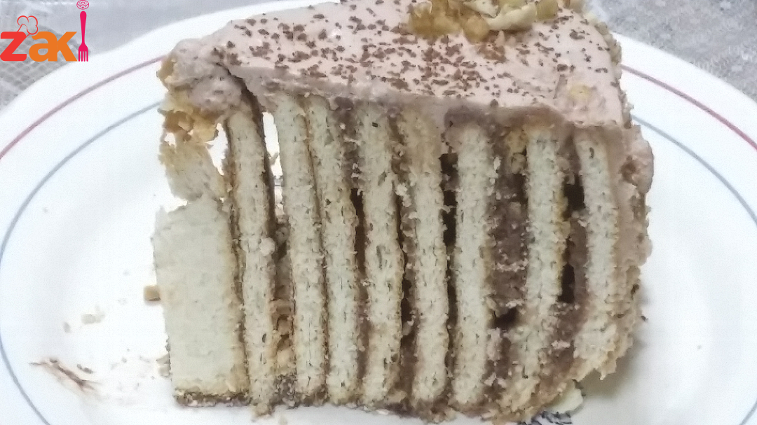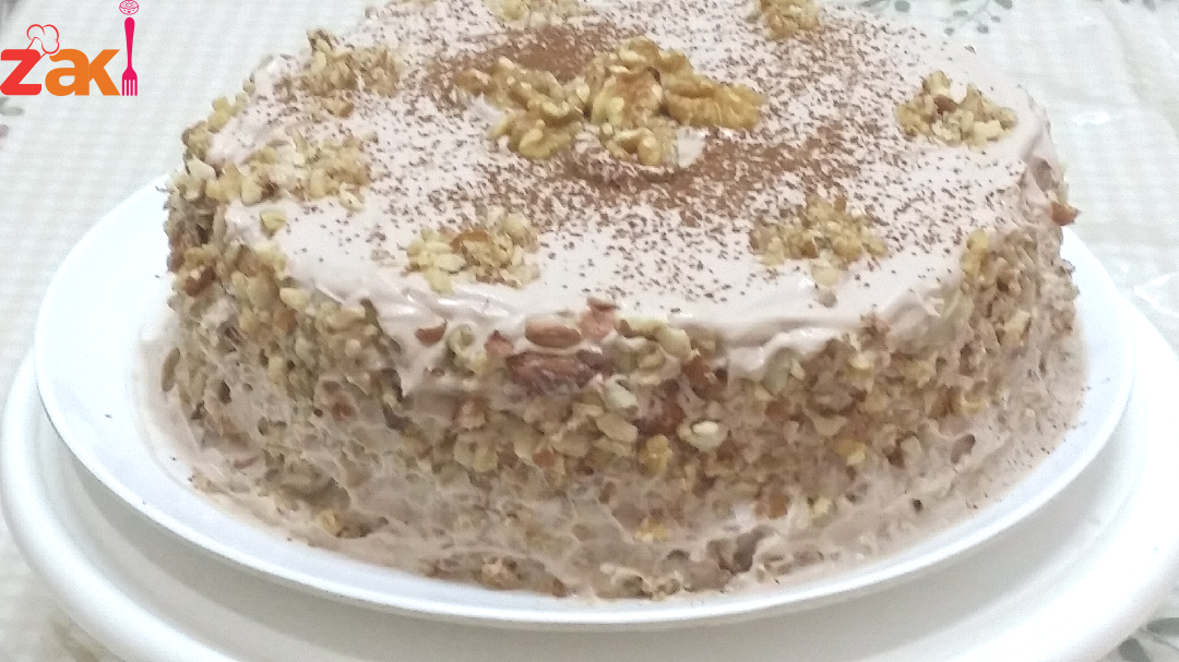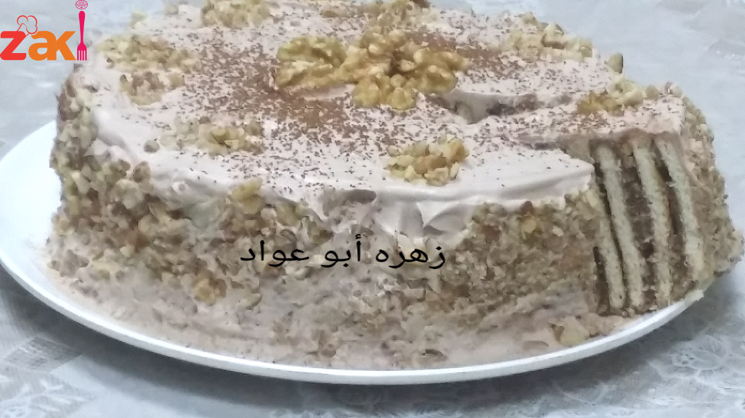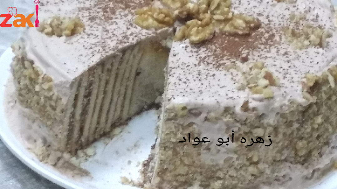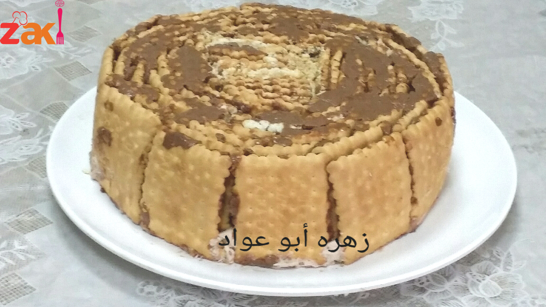حطي بالقالب نايلون صفي البسكويت في القالب اول صف وبعدين حطي على البسكوت خليط من الكريمة وصفي على في القالب وهكذا إلى أن تعبي القالب وبعدين حطيها بالشلاجه لحد ماتتماسك وبعدين حطي عليها باقي الخليط من الجوانب ومن فوق وحطي مكسرات مجروشة على جوانب الكيكه وزينيها بالمكسرات المتوفرة عندك