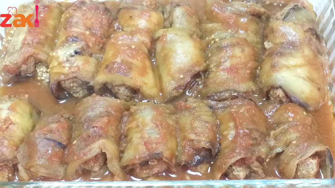 اعملي الكفتة بشكل رولات وحطيها على شرائح البيذنجان ولفيها لحد الانتهاء من جميع الكمية