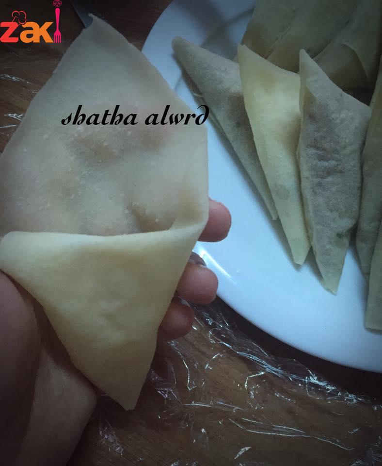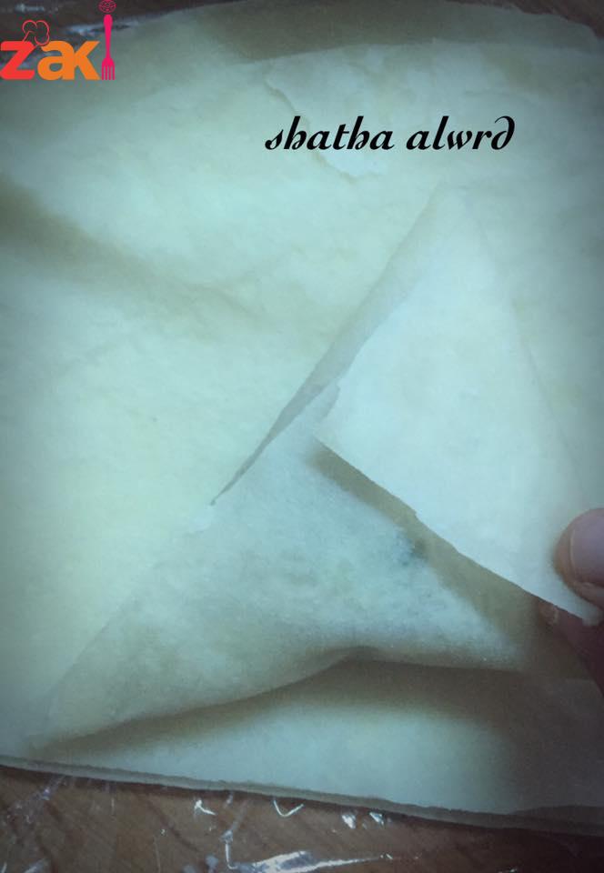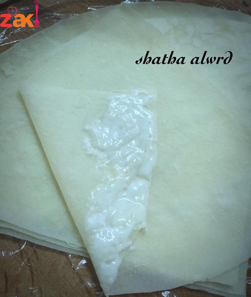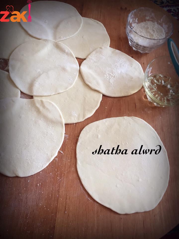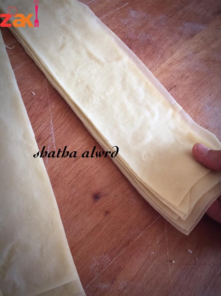ونقص الاطراف نساويها ونفتح الرقائق وهي حارة لكي لا تبرد وتلتصق وتوضع في ورق نايلون وتحفظ بالفريز او تحشى وتقلى مباشرةً