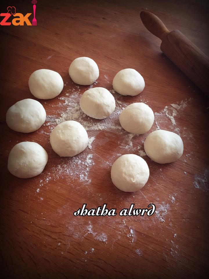 تعجن العجينة وهذه المقادير تعطي ٢٥قطعه تقريبا وتترك نصف ساعه بعدها تقسم الى كور صغيرة وترتاح دقائق