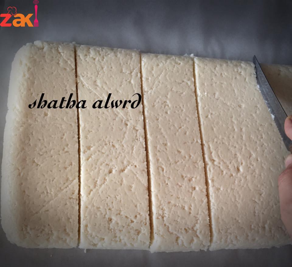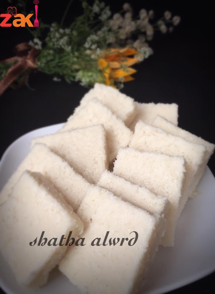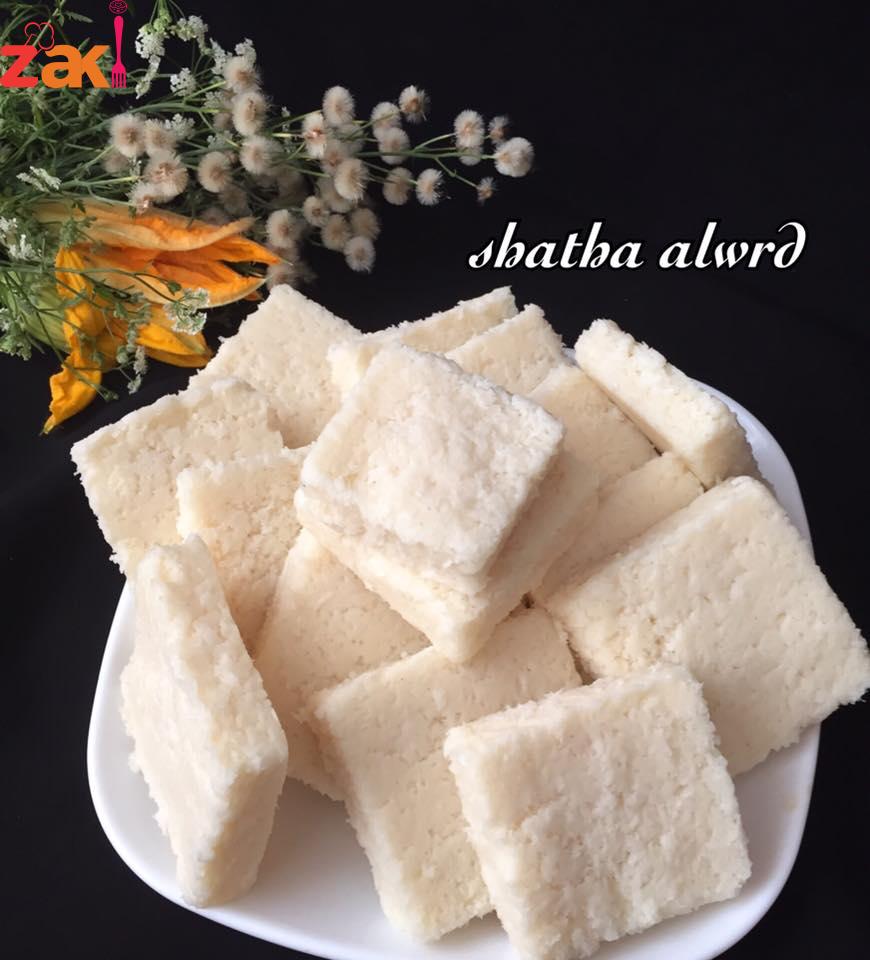 توضع جميع المقادير ع النار ماعدا جوز الهند لحين تغلي بعدها نضيفة ونصبة في قالب ونتركها بالثلاجة مدة ٤ساعات اني سويتها بالليل الصبح قطعتها