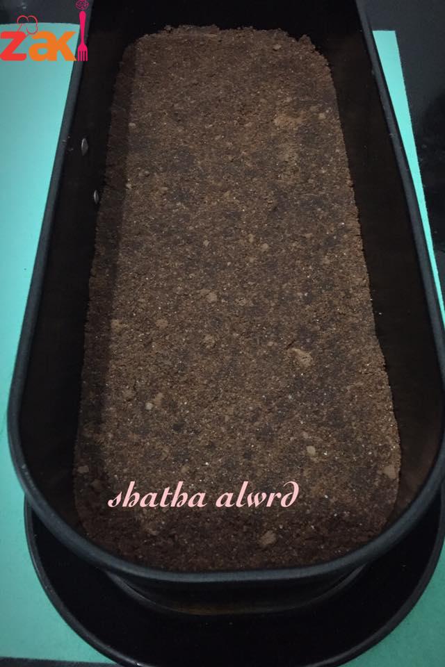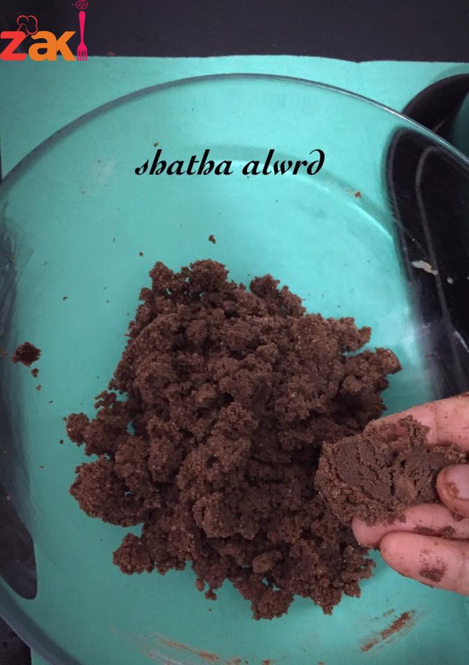 يطحن البسكويت جيداً ثم يضاف له نصف علبة قشطة ويعجين باليد ويوضع في القالب