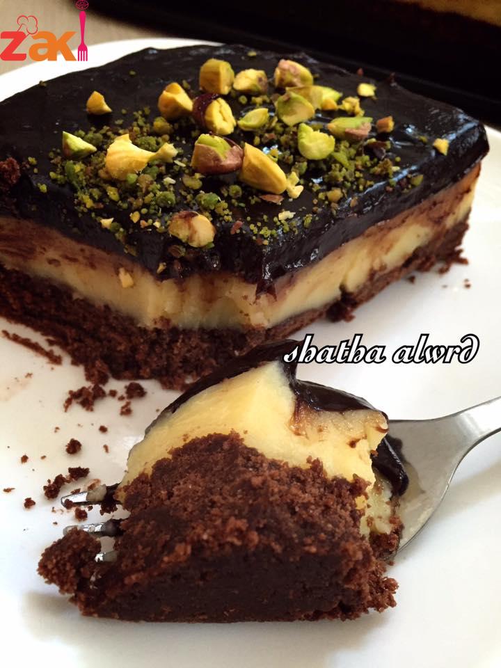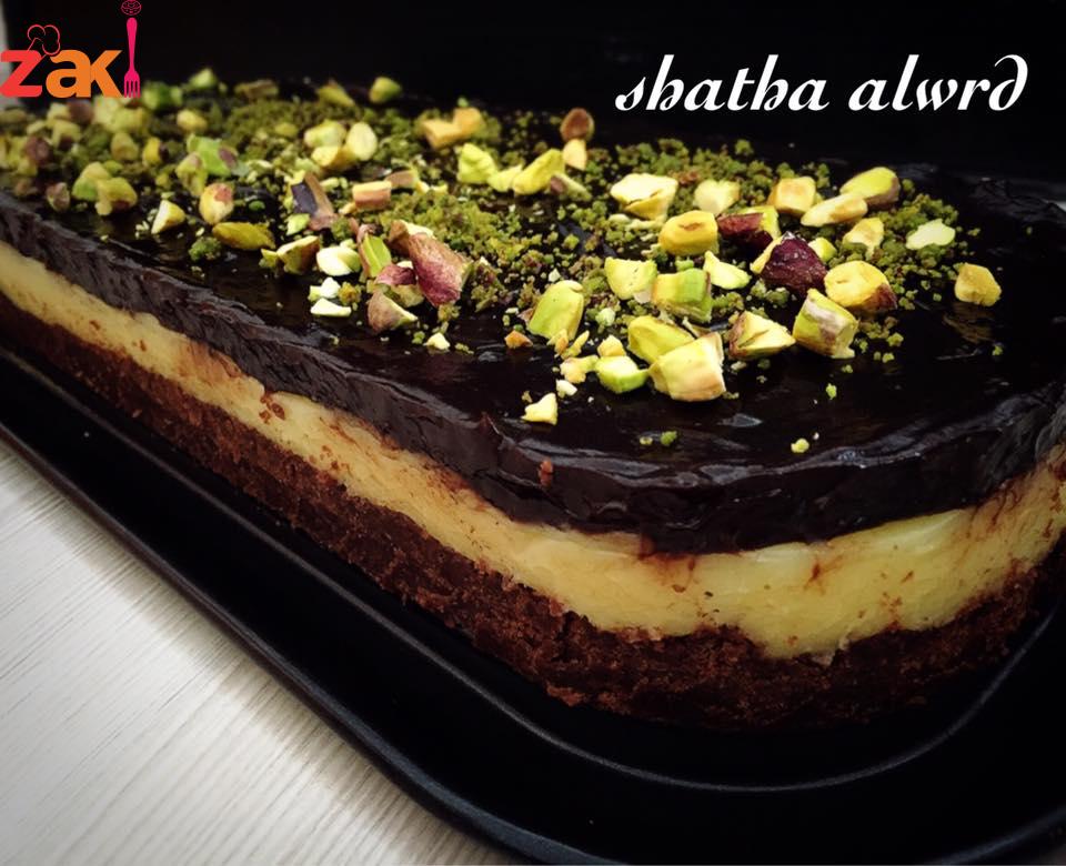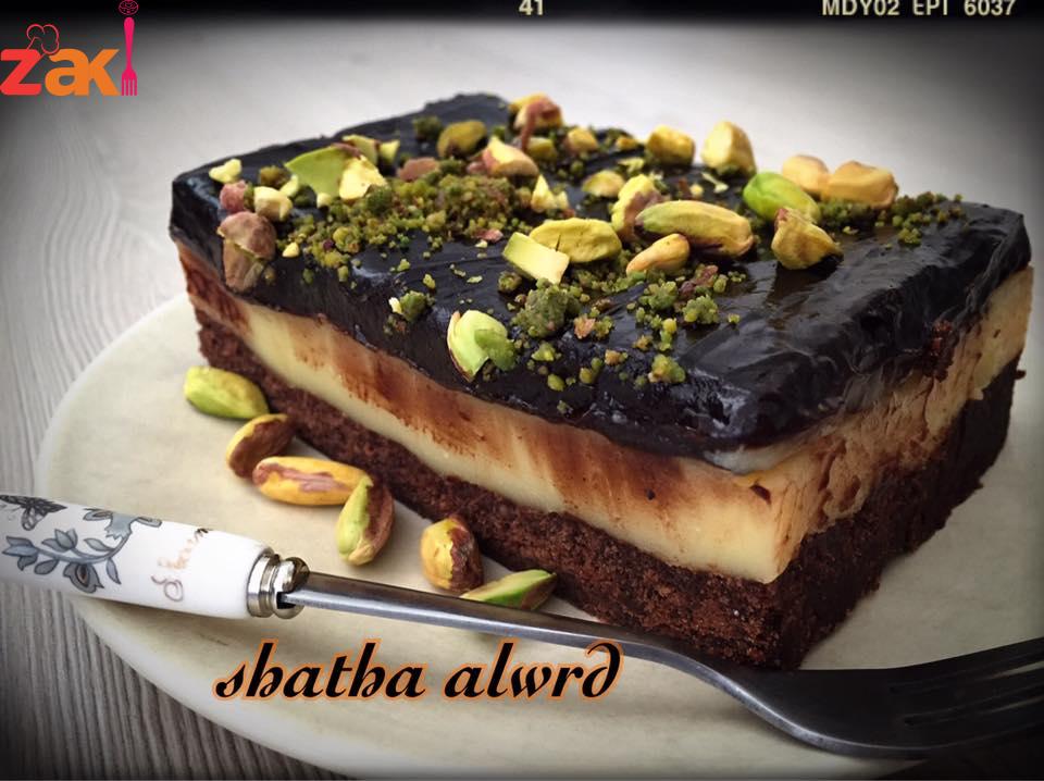 وادخله الثلاجة نصف ساعة بعدها اعمل نفس الطريقة بالشوكلاتة واصبها فوق الطبقة الثانية وتزين بالفستق وتترك تبرد وتقدم بعدها