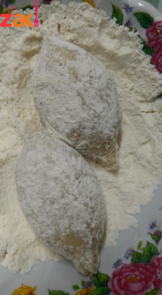 قبل القلي, بقلهم بالطحين ليعطي تماسك أكثر, وبقليه بزيت غزير وصحة وألف هنااااااااا