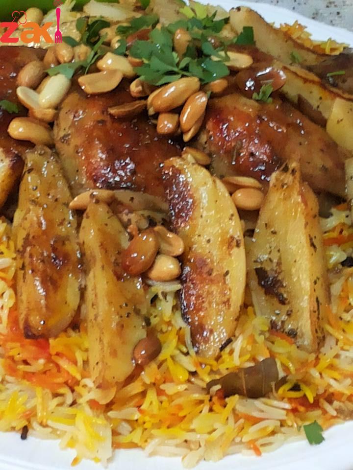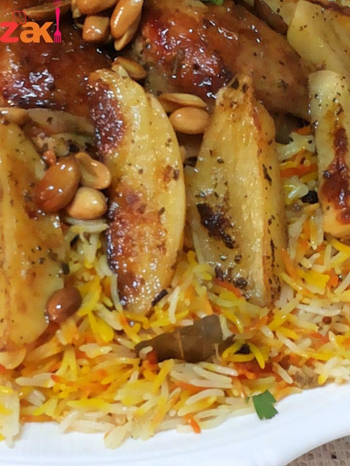 ثم حمي قليل من الزيت وضعيه فوق الأرز للمعة ونثر حبات الأرز, ثم ضعي الدجاج وزينيه بالمكسرات’ وصحتين وهناااااااااااااااا