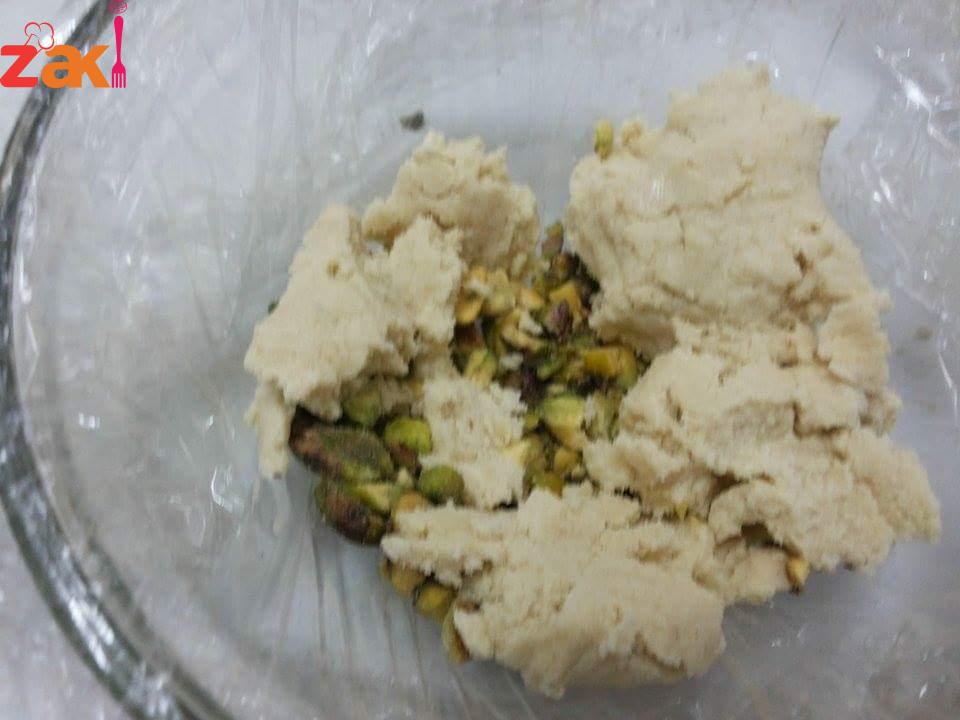 هنحضر بولة مناسبة او علبة ثلاجة او حتى علبة بلاستيك وتكون بحجم مناسب ونضع غلاف بلاستيك او حتى كيس نظيف بعد ذلك ننزل بأى نوع مكسرات فستق او بندق او سودانى او حتى بدون شئ ثم نأخذ قطعة ونحاول من خلالها وضع المكسرات على الجوانب ثم نضع بقية المقدار