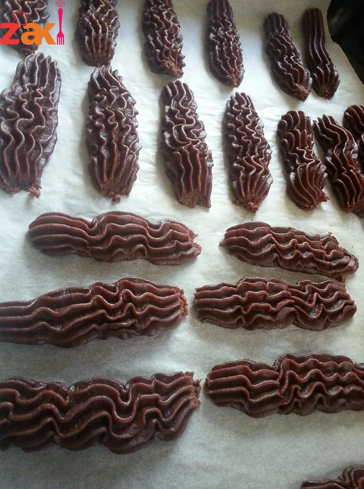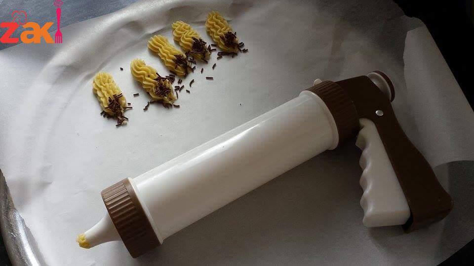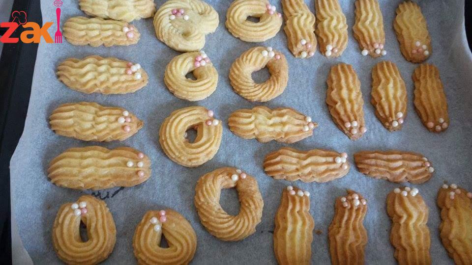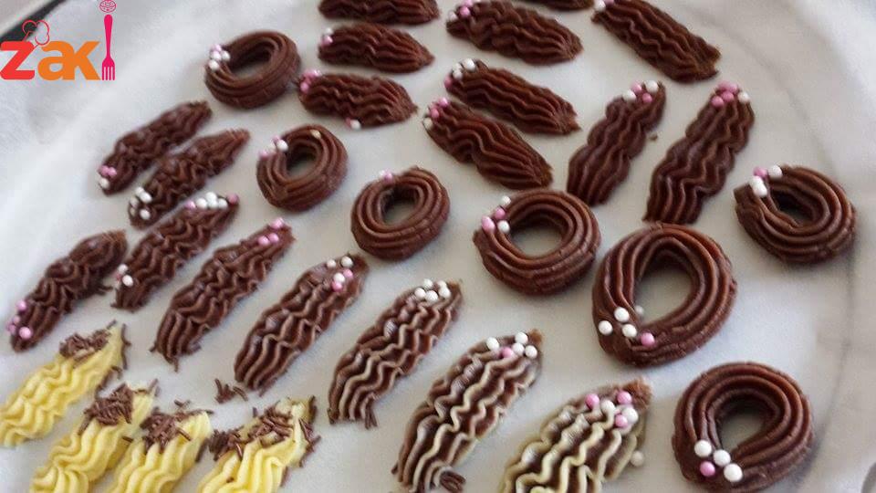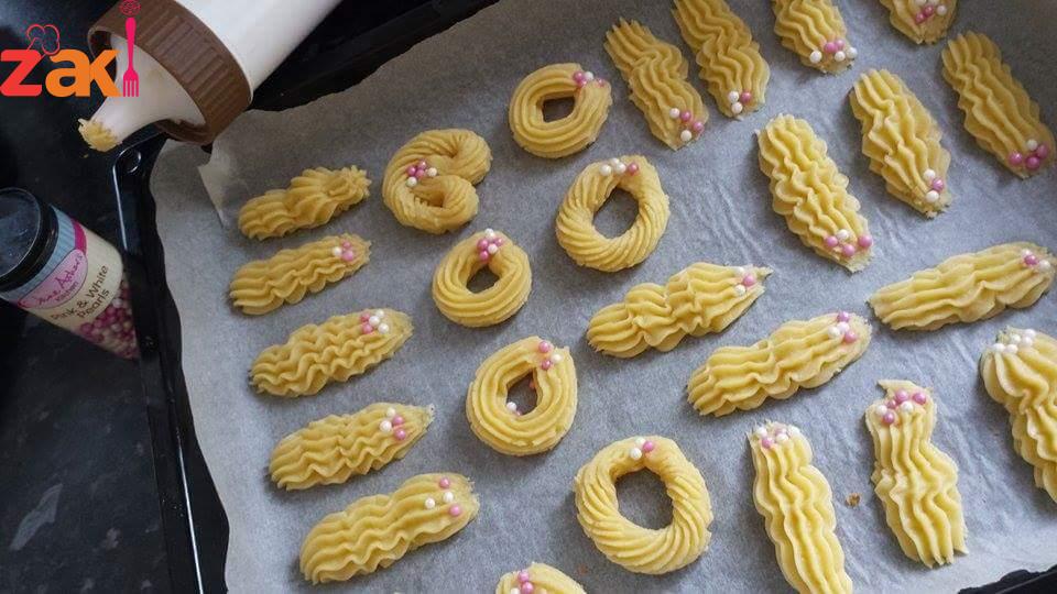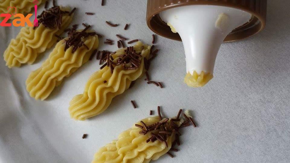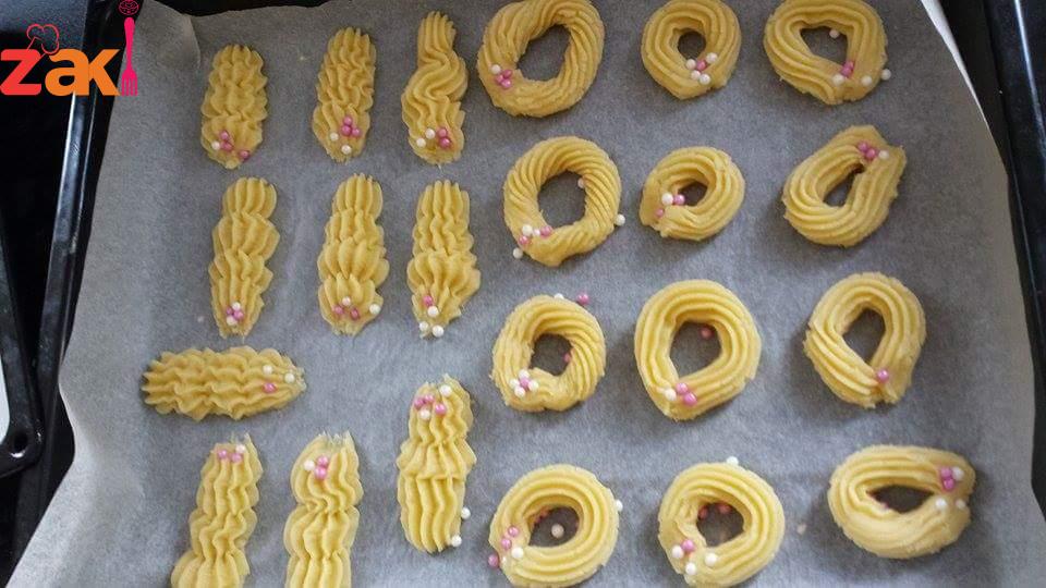 تشكل بآلة ضغط البسكويت أو تفرد وتقطع ﻷشكال وممكن بأي قمع للكريما نضع قطعة من العجينة ونضغط بأصبعنا ليطلع العجين بالشكل متل الصورة