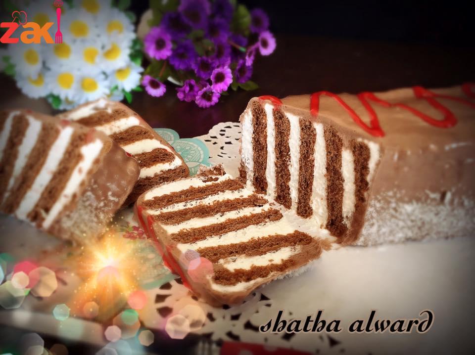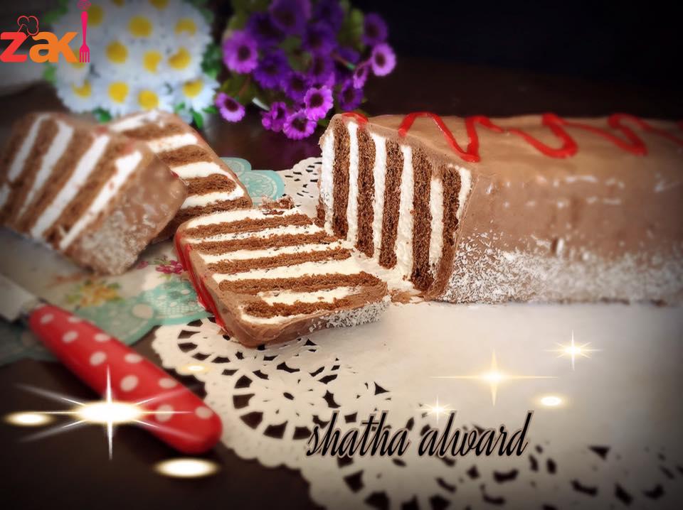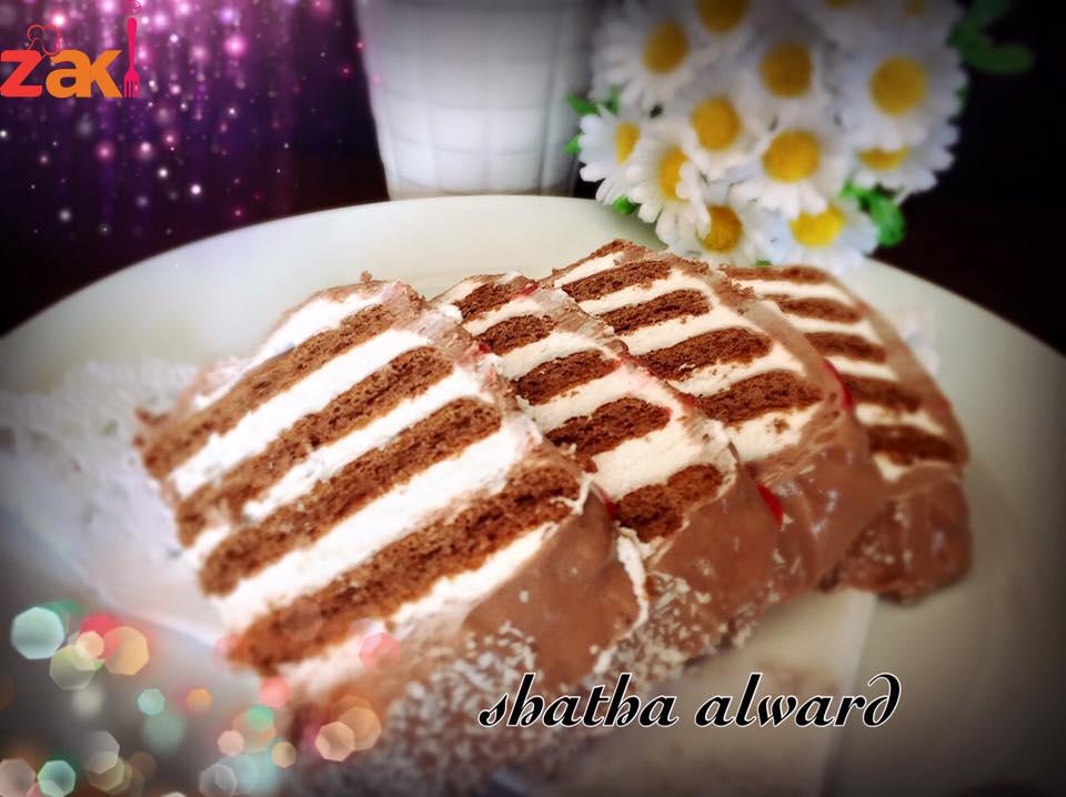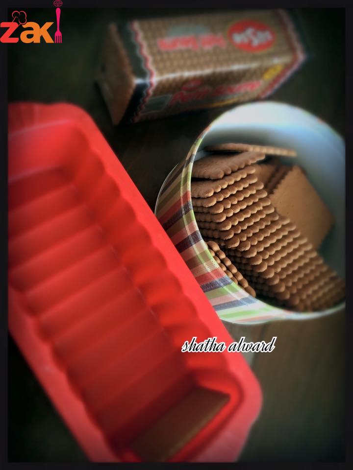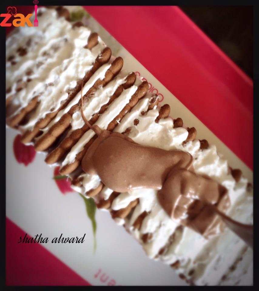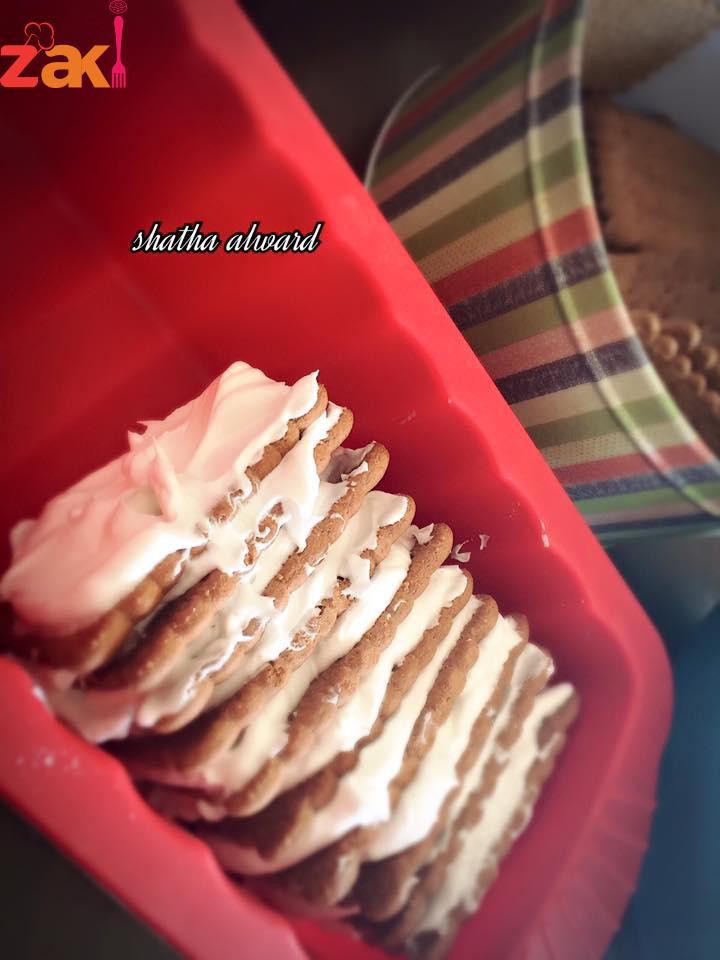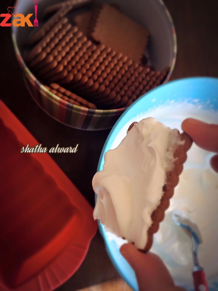 اولا نخفق مغلف كريم شانتي ونغطي البسكت وحدة تلو الاخرى ونصفهاا بشكل متساوي ادخلها الثلاجة ٢٠دقيقة وبعدهاا اطلعها اغلفها اما ب شوكلاته مذوبة بحمام مائي للسهولة أو مثل مسويت اني مغلف كريم شانتي وسويت بودنك بالشوكلاته البودنك هو مثل الكاستر او دانيت خلطتهم سوياً وغطيت بيهم البسكويت ودخلته الثلاجة ساعة او ساعتين وبعدين نقطعه بشكل منحني مستقيم حتى يصير بالشكل هذاا الي بالصور ونقدمه ياربي تعجبكم هالوصفةالبسيطة ☺️