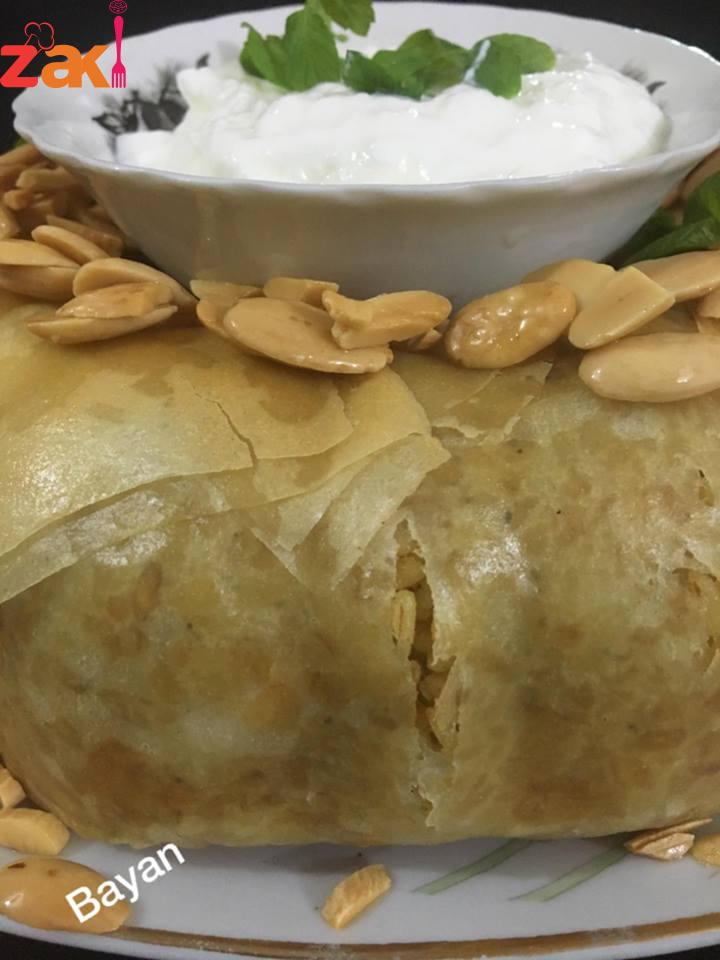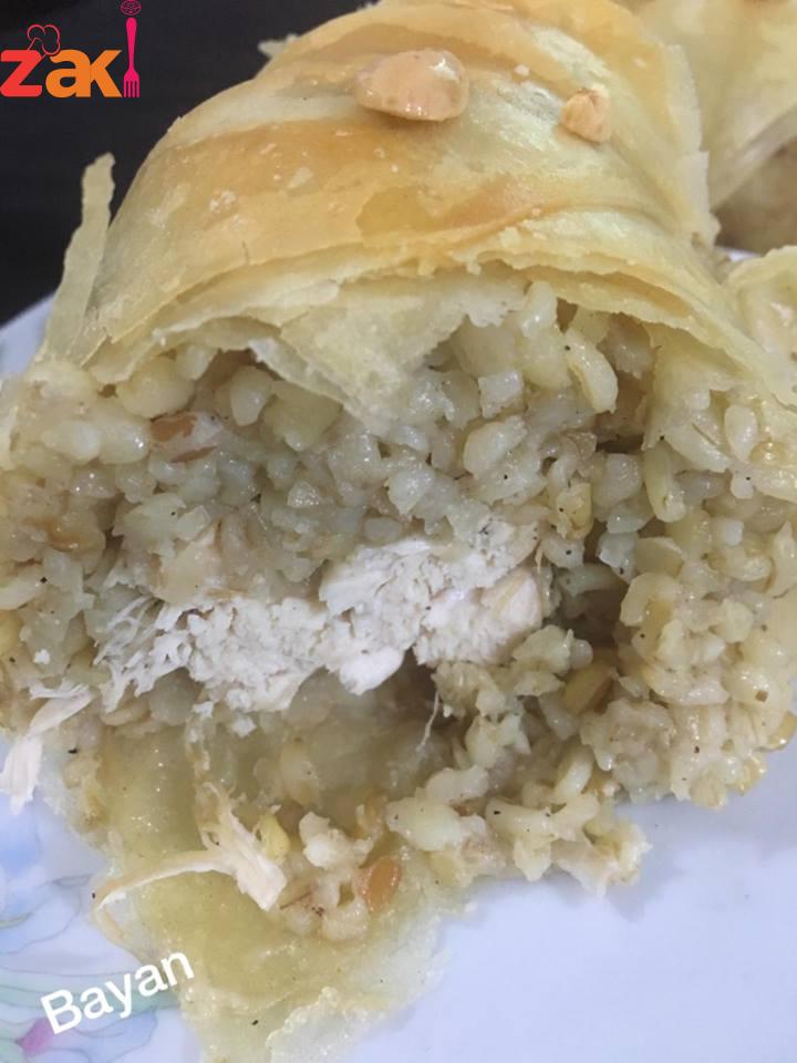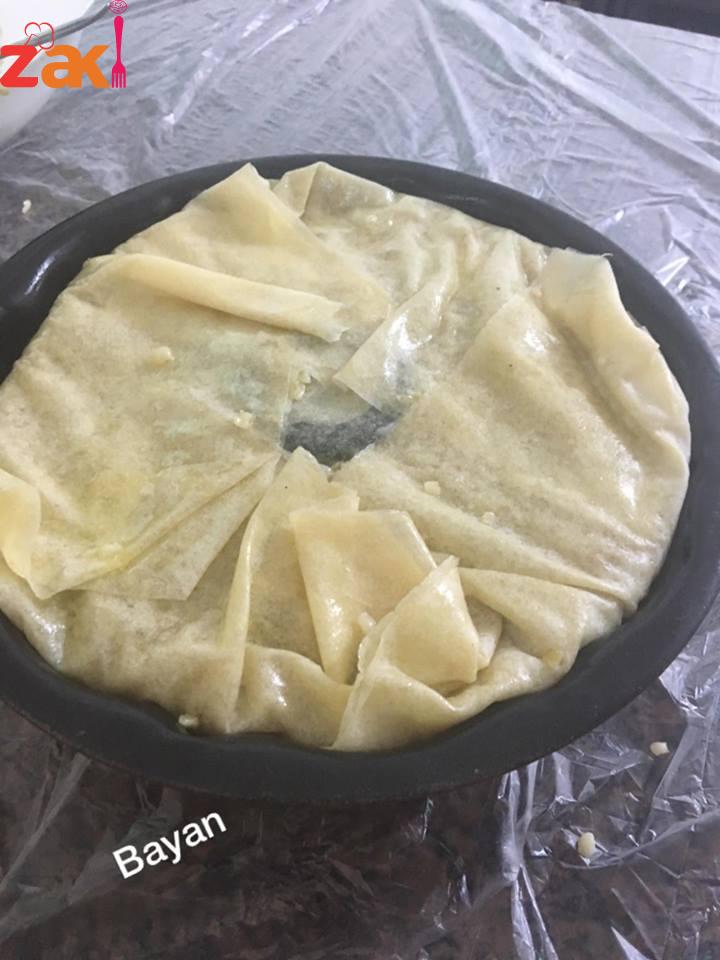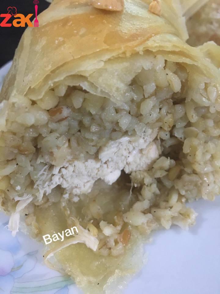 يدهن قالب بالسمن وتدهن شرائح الكلاج ( كل شريحتين معا ) بالسمن وتوضع بالقالب ليغطي الجوانب والأرضية ، مع ابقاء جزء من العجينة للخارج لتغطية القالب نضع نصف كمية الفريكة وتصف قطع الدجاج ثم باقي الفريكة وتغطى بالعجينة وتدخل فرن على درجة حرارة ١٨٠ تقريبا ٣/٤ الساعة أو حتى يصبح لونها ذهبيا … تقدم مع اللبن الزبادي … صحتين