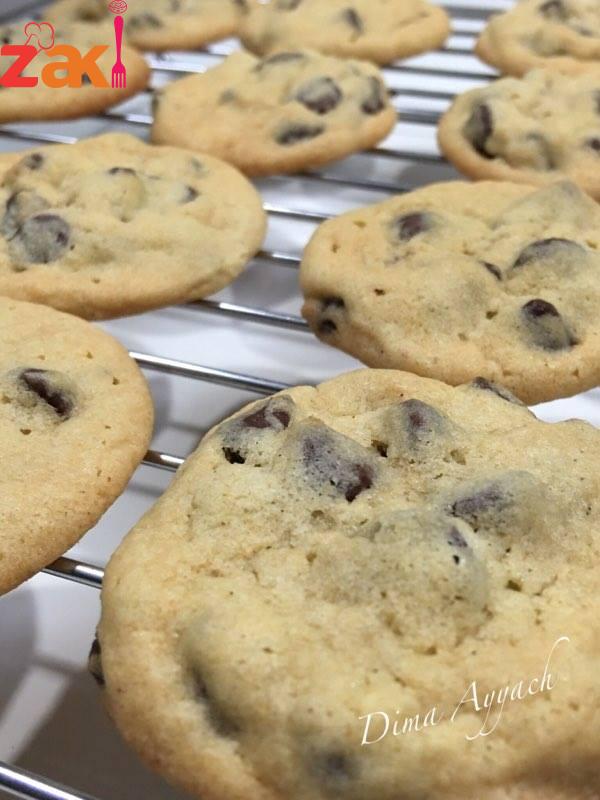 المقادير : ٢ و ربع كأس طحين منخول مع نصف م ص بيكربونات الصوديوم ١ م ص ملح —- ١ كأس سكر بني فاتح نصف كأس سكر أبيض العادي ٢ اصبع زبدة طرية بحرارة الغرفة ٢ بيض بحرارة الغرفة ڤانيليا ٢ كأس شوكولا الحبيبات نصف محلاها ( semi sweet)