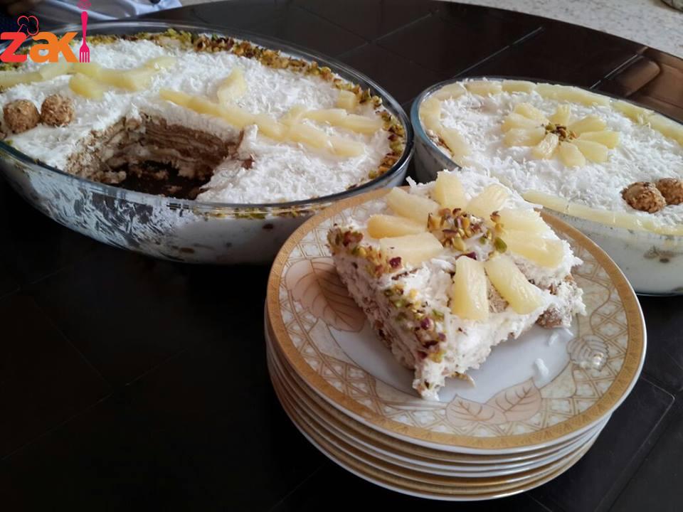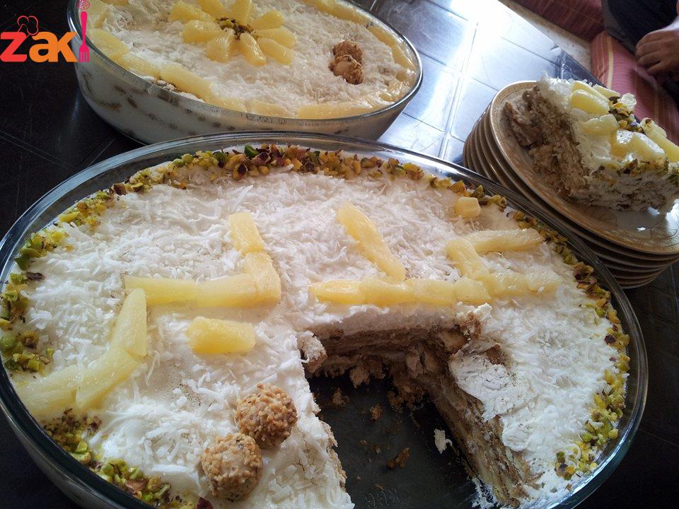 بتغلي نسكافية مرة وبتركيها تبرد وبعدين بتجيبي بسكويت سادة وبتغطسي بالنسكافية وبتصفطي بجاط البايركس وبعدين بتكوني خافقة كريما مع علبة قشطة بتحطي منها طبقة فوق البسكويت وبعدها بتحطي أي نوع فواكة بدك ياه متﻻ أناناس فراولة كيوي موز وبعدين بتعملي طبقة تانية من البسكوت المغطس بالنسكافية وبعدها كريما يعني بتزيدي طبقات ئد ما بدك وآخر شي بتزينيها وبتحطيها بالتﻻجة ليلة كاملة قبل التقديم ♡ وألف صحة وهنا