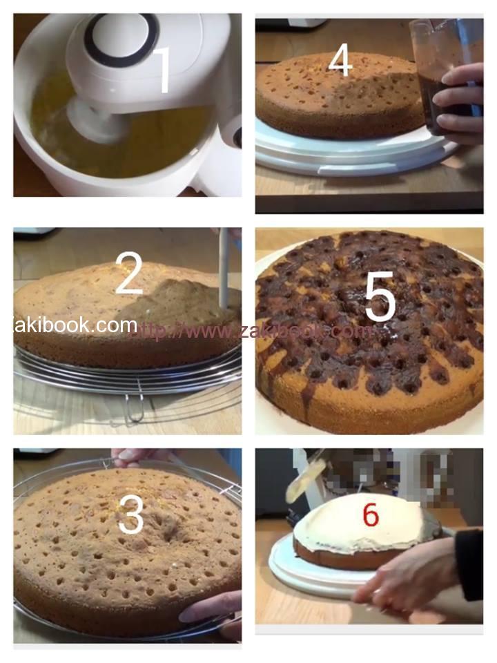 – بعد اخراج الكيك من الفرن نضعه على الشبكة ونقوم بوضع ثقوب على سطحه بواسطة عود او سيخ ( صورة2 و 3).