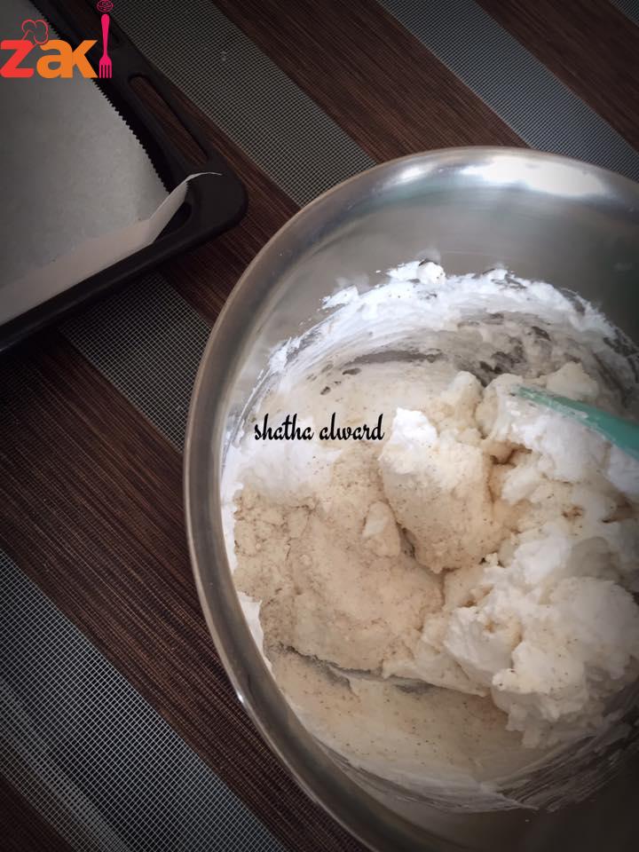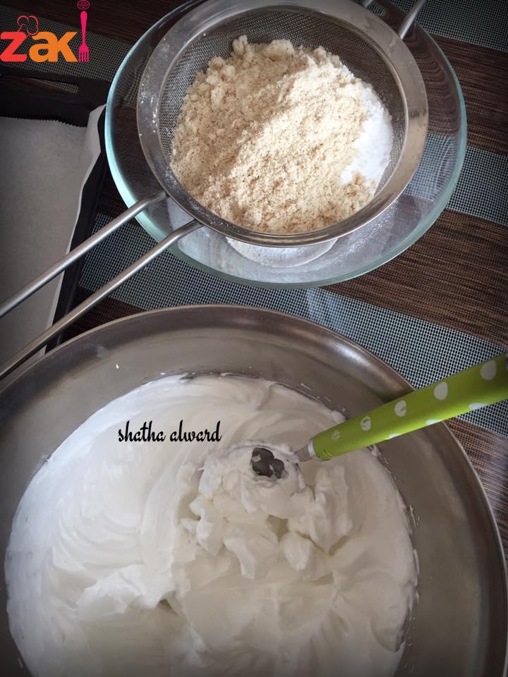 نخفق بياض البيض لما تصبح رغوةة وابدي اضيف السكر الخشن خمسة ملاعق طعام بالتدريج لماا يصير مارينك ثقيل مو خفيف وطبعا انخل اللوز المطحون والسكر معاً واضيفهم ع مارينك الي هو بياض البيض والسكر بالتدريج واخفق بهدوء وبعد ميتجانس تماماً