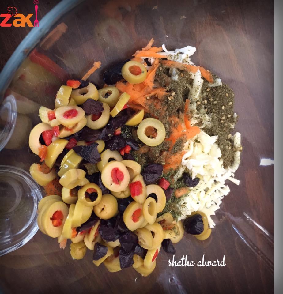 نصف كاسة زيت ،،كاسة لبن ،،،زيتون اخضر +أسود