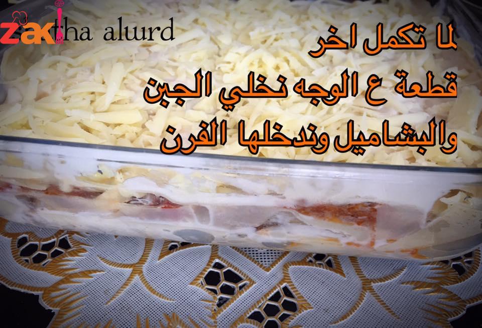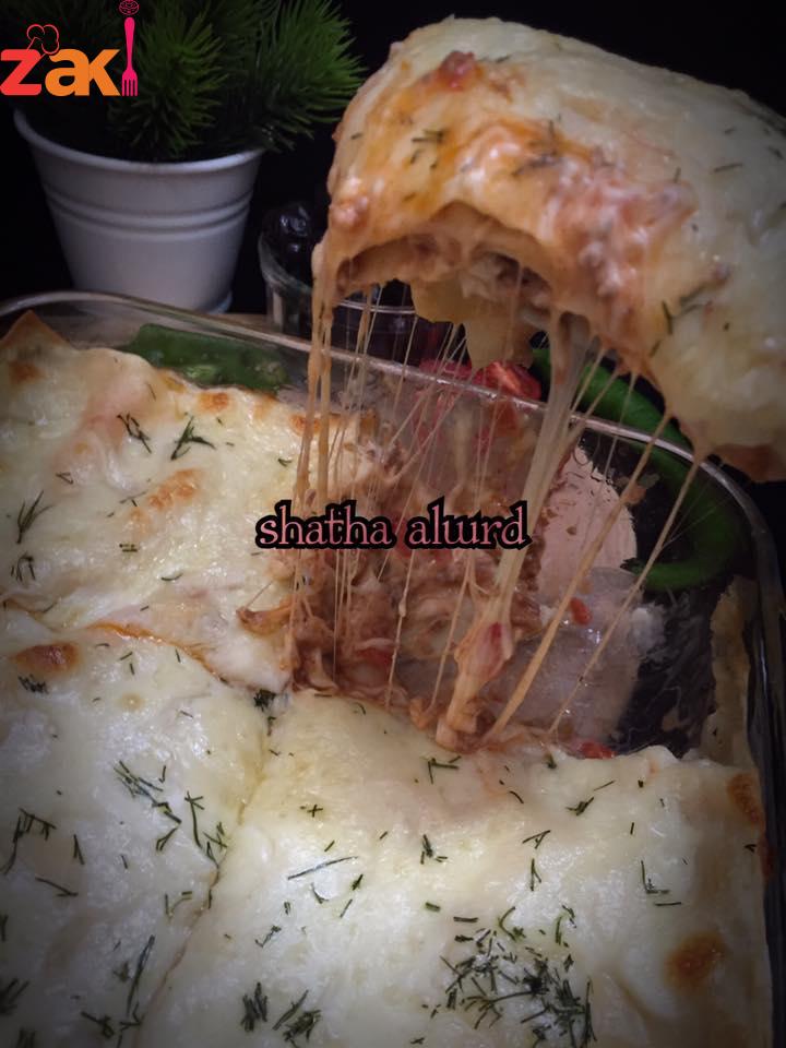 او مباشرة ع البايركس وادهنها بقليل من الزيت وطبعا اكيد اني مجهزة مسبقا الحشوةة والبشميل واضيف قسم من البشميل وقليل حشوةة وجبن شيدروايضا طبقة اخرى نفس الشي لما تكمل جميع الطبقات اضع ع الوجه البشاميل والجبن وادخلهاا الفرن اشويهاا