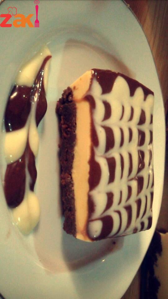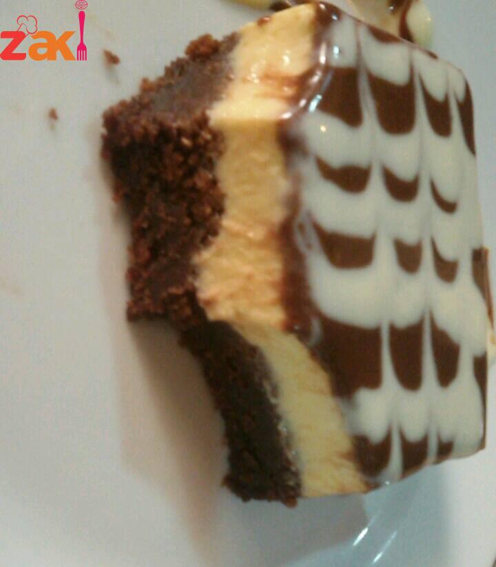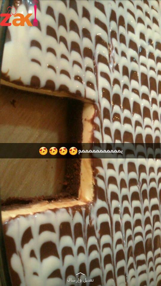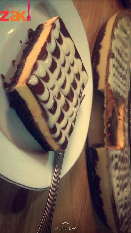 كاسة ونصف ماء مغلي ديريهم على ظرفين كريم كراميل وبالخلاط حطي 6 حبات جبن كيري وعلبة قشطة وظرف دريم ويب وديري عليهم خلطة الكراميل واخليطهم سوا, وديريهم فوق الكيك بس تجمد زينيها مثل ما بتحبي آنا زينتها بصوص أبيض, وصوص الشكولاتة.