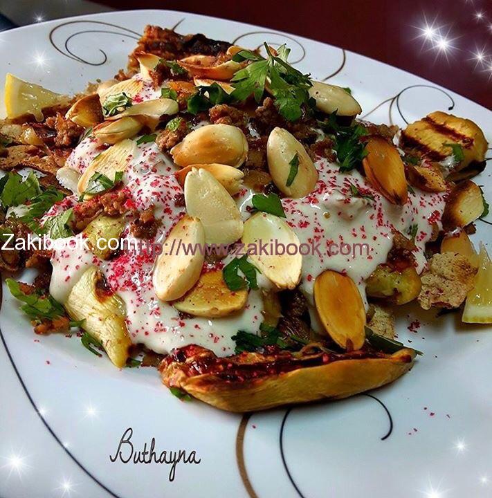 – وأخيراً نزين فتة المكدوس بشرائح اللوز محمص بالفرن بدون زيت.