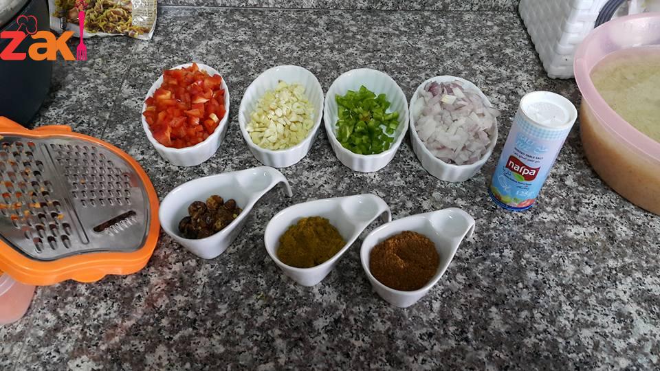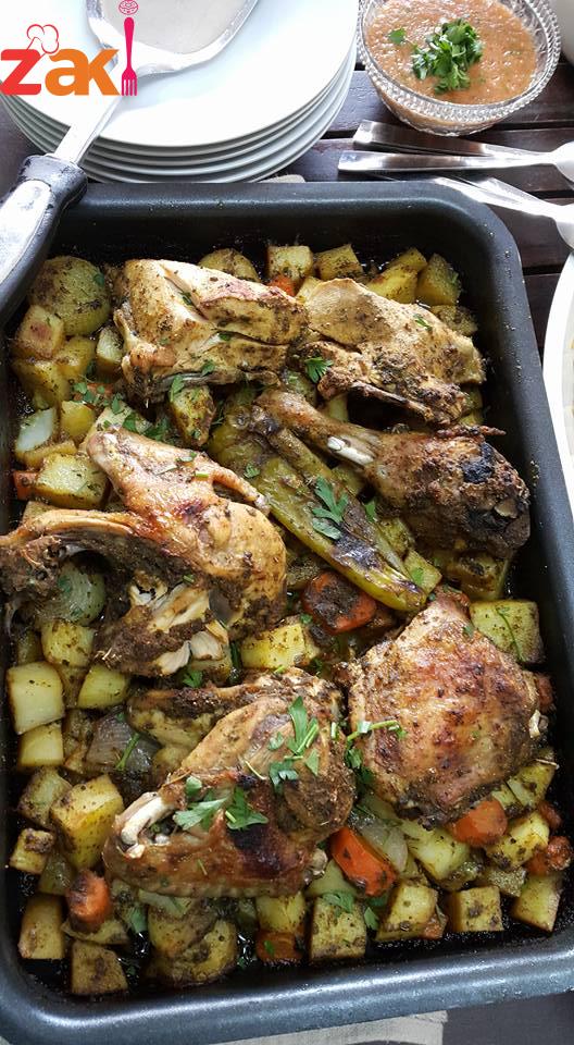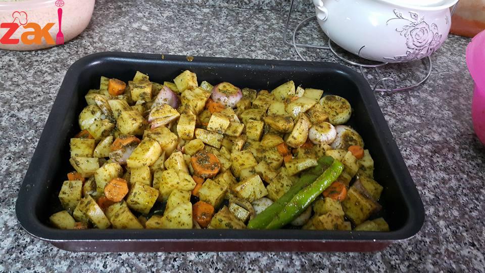 بخلط كل المكونات مع بعض وبخلط الجاج معهم وبضيف الهم يادوب فنجان قهوه مي وبغلفهم بالقصدير وبحط الصينية بالفرن لمدة ساعة ونص وبعدين بطلعها وبحمرها