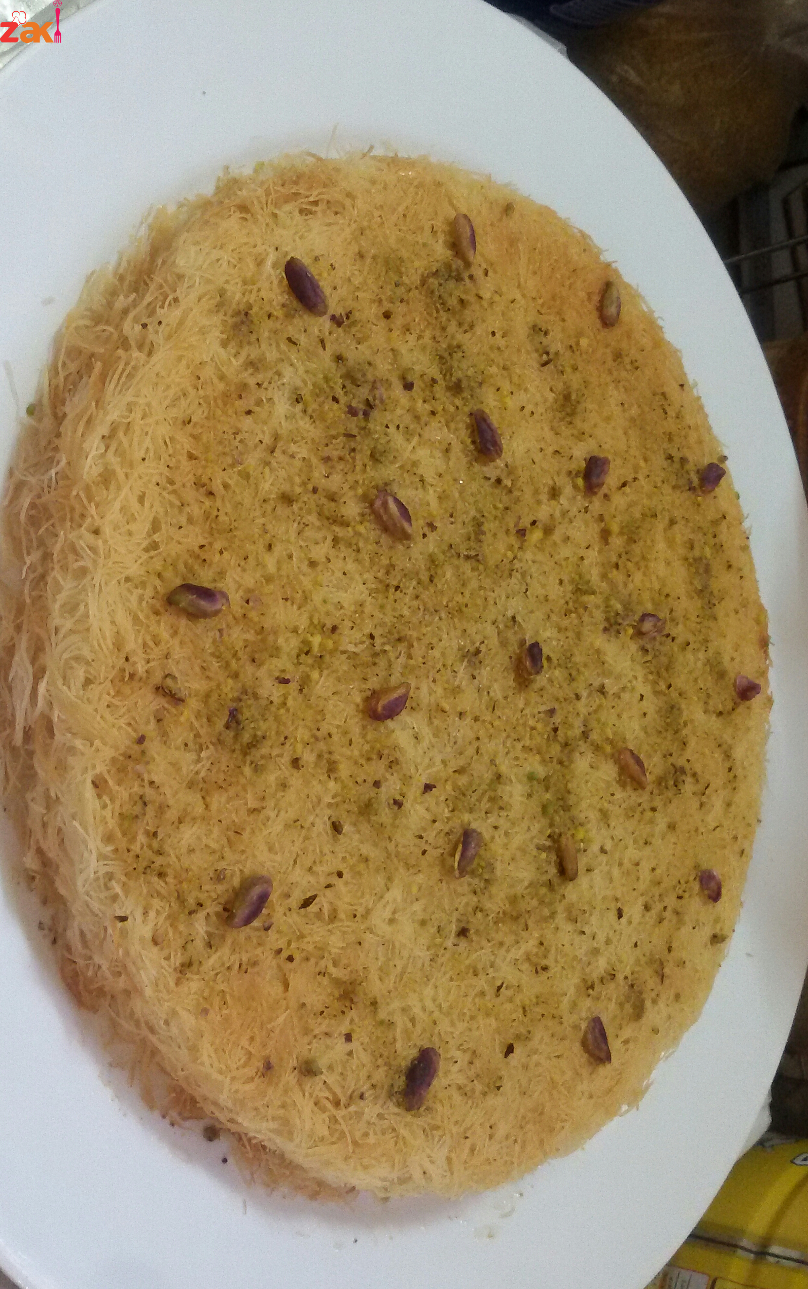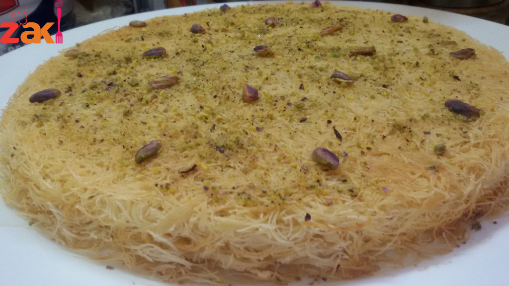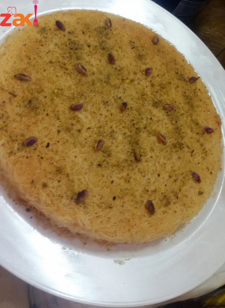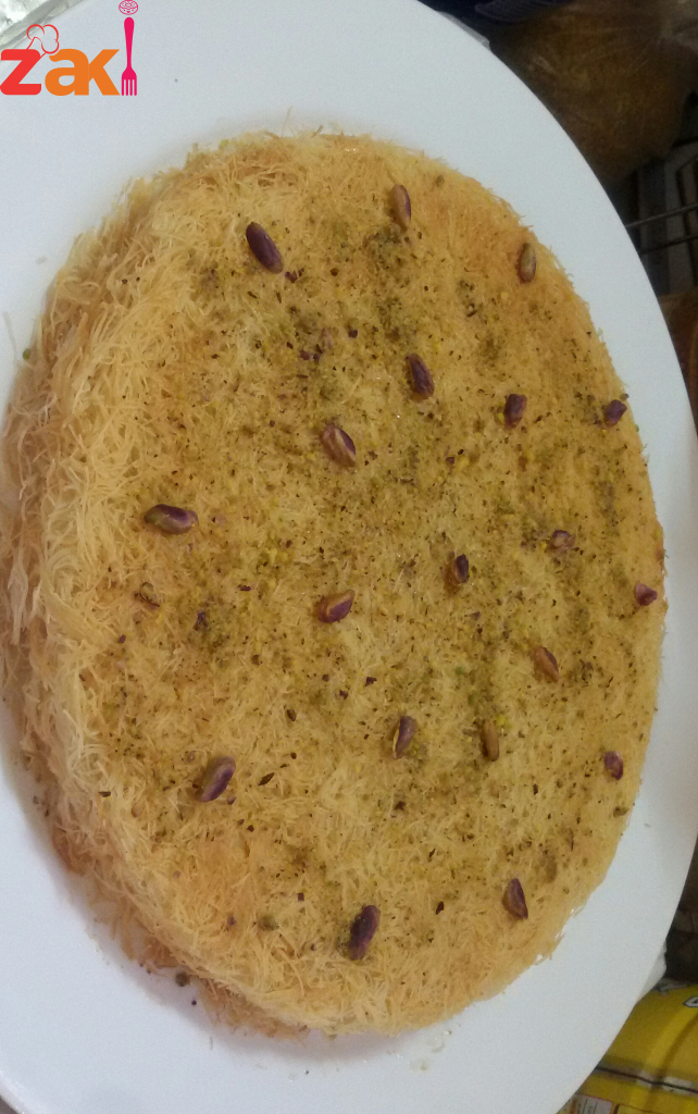 ونذوب الزبده ونسكبها فوقها هي والزيت ونشربها جيدن بهم ثم نقسمها نصفين نصف نضعو في صينيه ونظغطه بشكل جيداً وندخله فرن محمى من فوق وتحت لحتى تتشقر من الطرفين ثم نخرجها ونصب الحشو ونراعي أن لا تصل الى الأطراف ونرص الطبقه الثانيه من الكنافه فوق الحشوه ونكبس بشكل بسيط ونشويها من فوق فقط ونقلبها بصحن التقديم ونسقيها قطر بارد ونزينها بلفستق وصحه وهنا ?