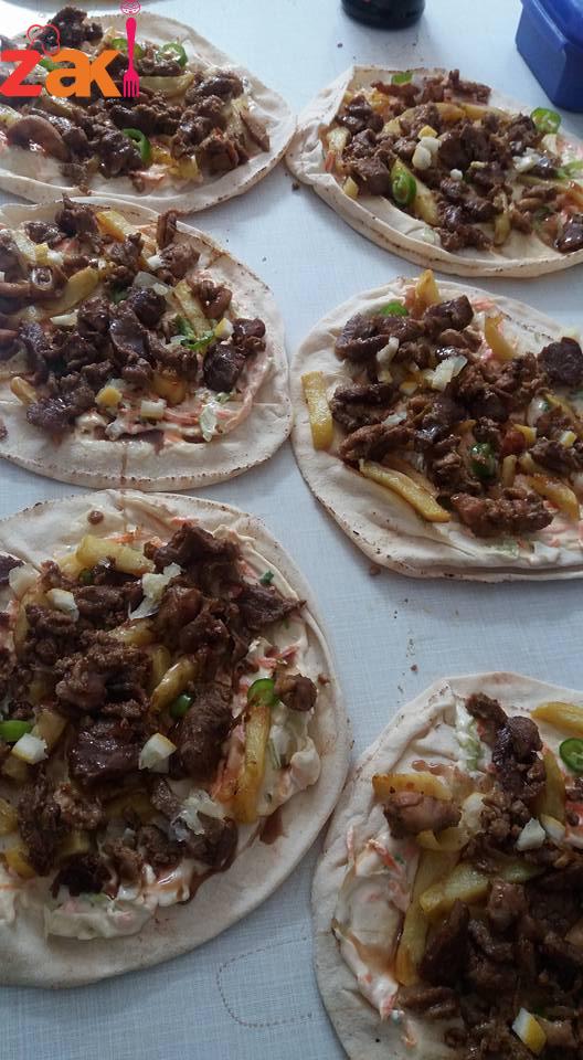 بعدين بنحط اللحمات بطنجرة لحتى تنشف مياتو و يستوا بعدين بجيب الخبز العربي وبدهنو بالسلطة الروسية المكونة من مايونيزوملفوف وجزر مبروش وفوقها طبقة بطاطا مقلية وفوقها بحط اللحمة وبرشها بدبس رمان وبحط الطبقة التانية من الخبز وبجيب مقلاية وبدهنها بشوية زيت وبحمرها عالوجهين عالغاز وبعدين بقطعها ويقدمها وصحتين وهنا
