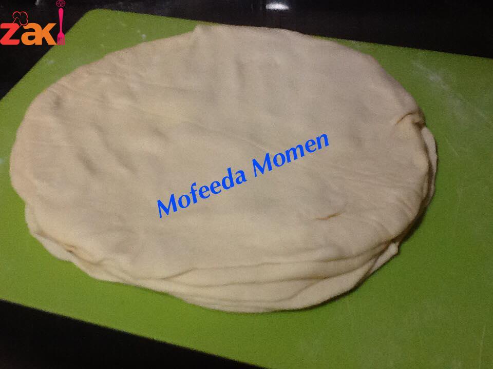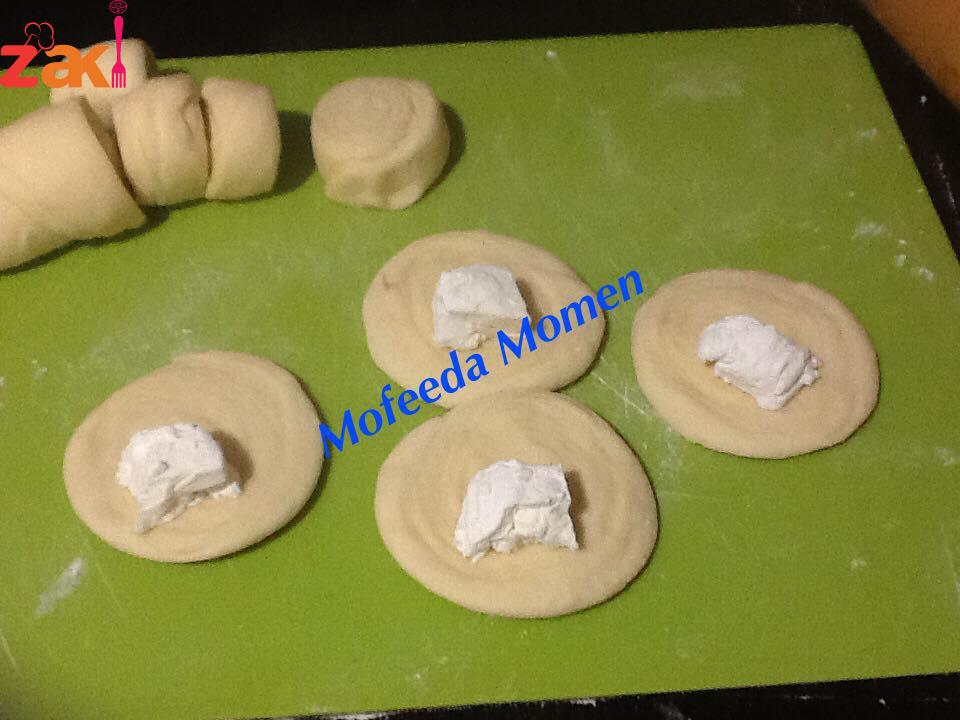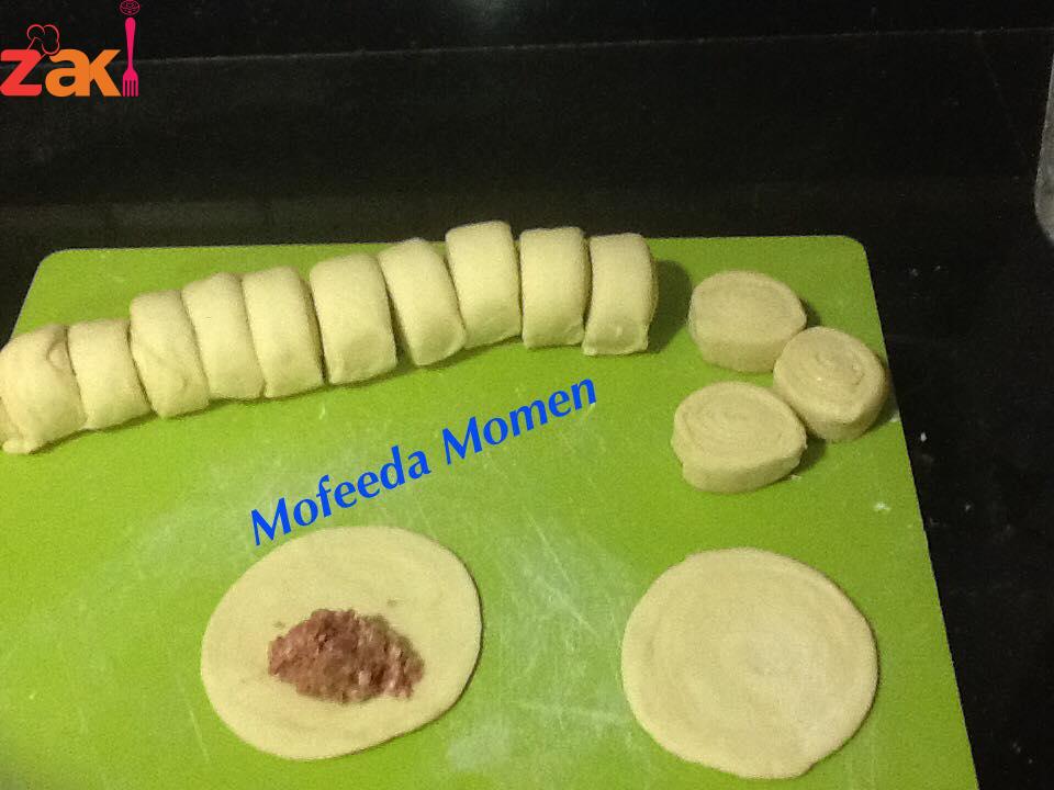 تخلط المقادير مع بعضها وتعجن بالحليب وتترك تخمر وبعد ان تخمر تقطع الي كريات بحجم الكرة الصغيرة وتفرد كل كرة علي حدا وتوضع علي كل واحدة م ك من الزبدة ثم ترص الفطائر فوق بعضها وتفرد بالنشابة ثم تلف علي شكل أسطوانة -تقطع الأسطوانة الي دوائر ثم تفرد كل دائرة وتحشي بحشو الكفته او الجبنة البيضاء وألف هنا #مفيدة#