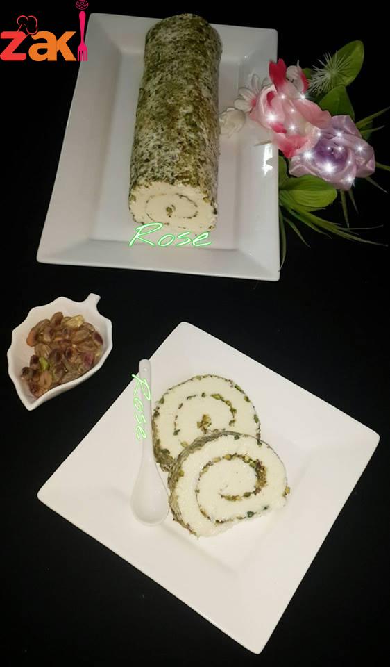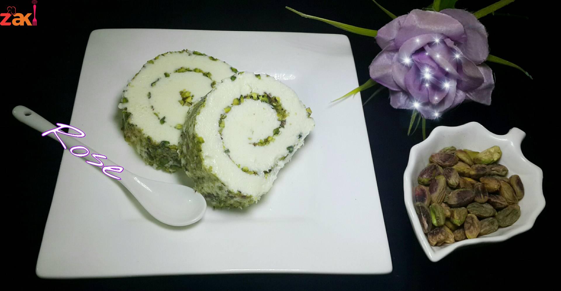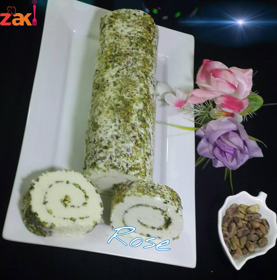 يخلط الحليب مع الماء جيدا ويضاف للكريمه ويخلط بالملعقه أو الخفاقه اليدويه ثم يضاف السكر والفانيﻻ والقشطه وتقلب جيدا وأخيرا المستكه والسحلب وبالخلاط الكهربائي لمدة دقيقتين فقط يصفى وتوضع ورق زبده ف صينيه ويفرش ويوضع بالفريز لمده 3 ساعات أو أكثر يخرج من الفريز ويرش الفستق المطحون ع الوجه وتلف ع شكل رول ويرش فستق من الخارج وتلف بكيس نايلون وبالفريز لمده 12 ساعه وتقطع وتقدم وصحه وهنا