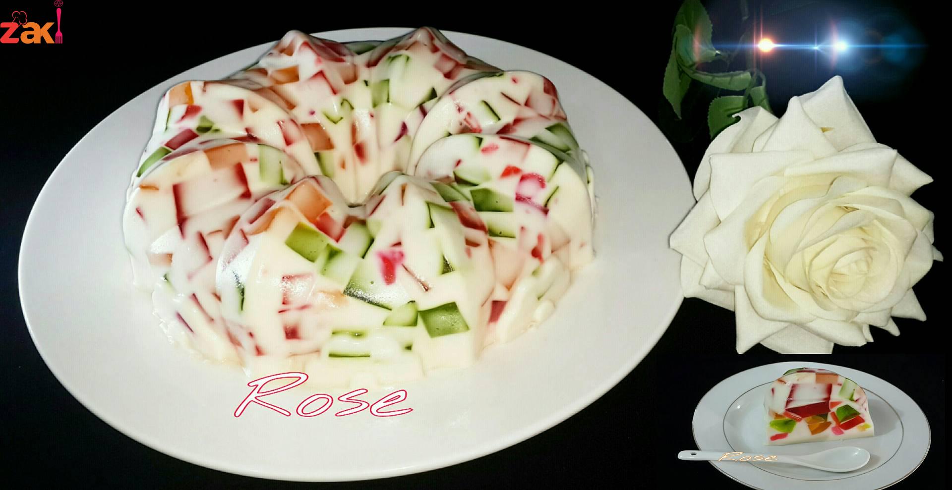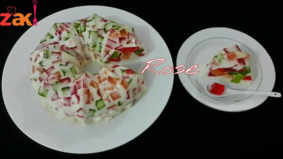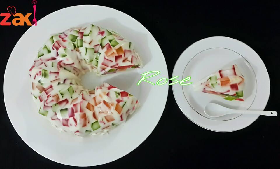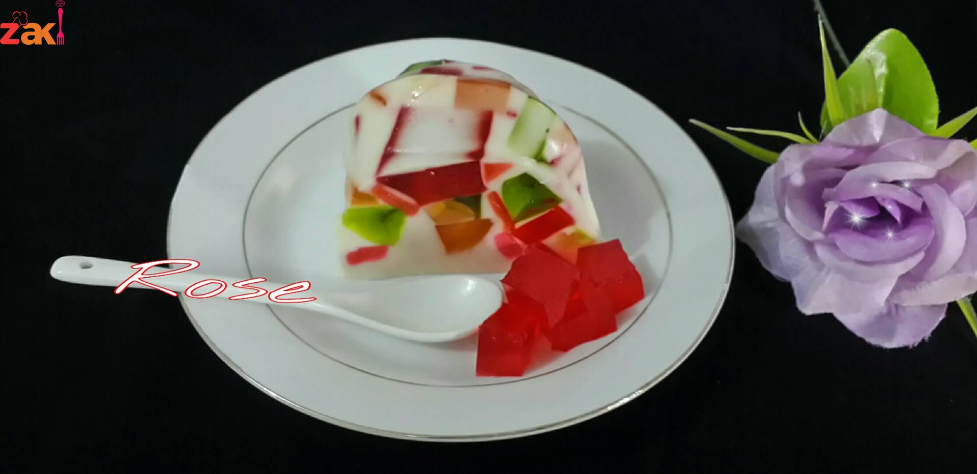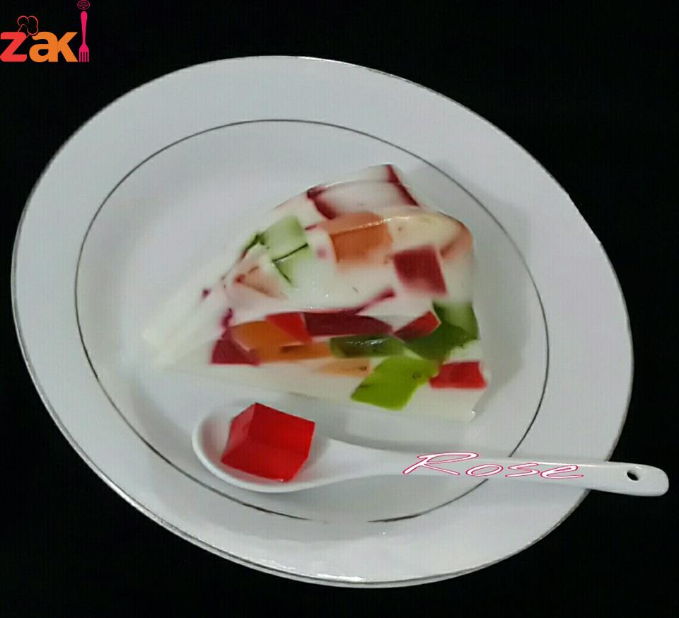 يذوب كل باكيت جلي ب ثلاثة ارباع كوب ماء ع النار ويصب ف علب مستطيله ويترك ليبرد ويقطع ع شكل مكعبات يترك جانبا يذوب الجلاتين ف الماء ويترك حتى يبرد تخلط الحليب والقشطه والحليب المحلى والفانيﻻ ويضاف له الجلاتين البارد ثم مكعبات الجلي ويخلط ع الخفيف يصب ف قالب سيليكون مدهون بزيت ويترك بالثلاجه حتى يتماسك ويقلب ف صحن التقديم والف عافيه