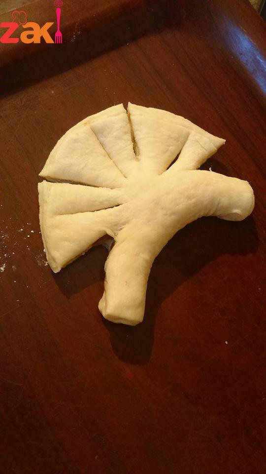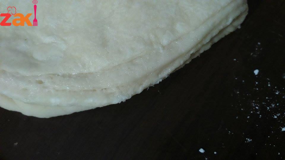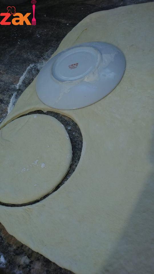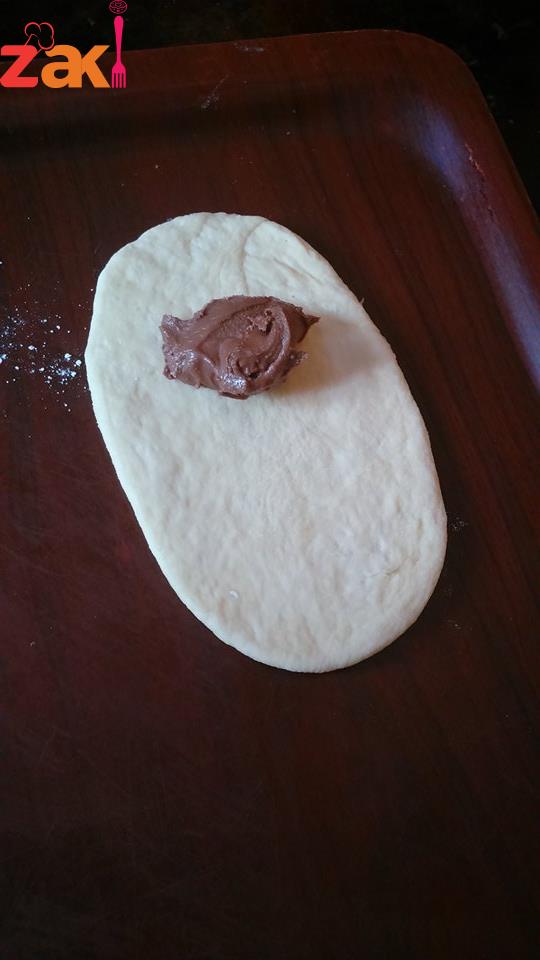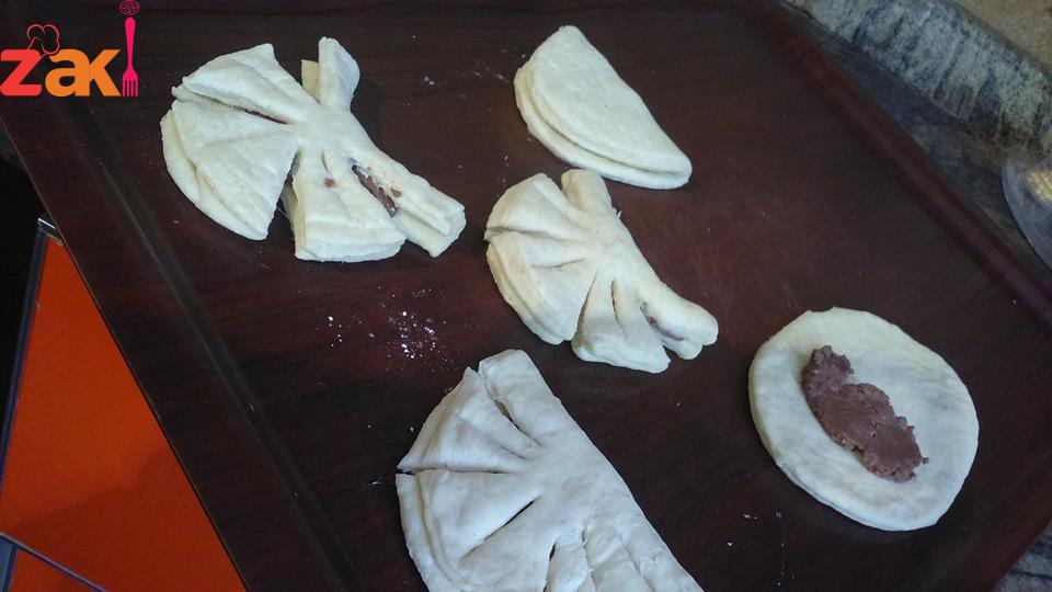 بعدين تفرد وتوضع فيها زبدة التوريق وتطوي العجينة وتفرد ثلاث مرات ويمكن الاستعانة بالدقيق في الفرد تشكل زي الصورةوتحشي بالشكلاتة أو كريم باتسييير .